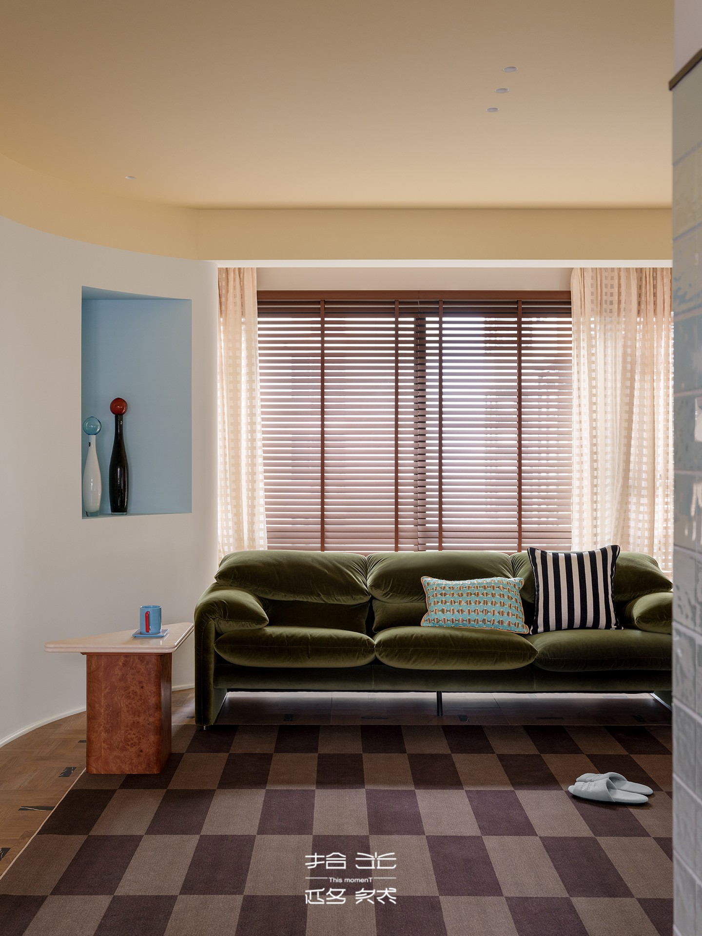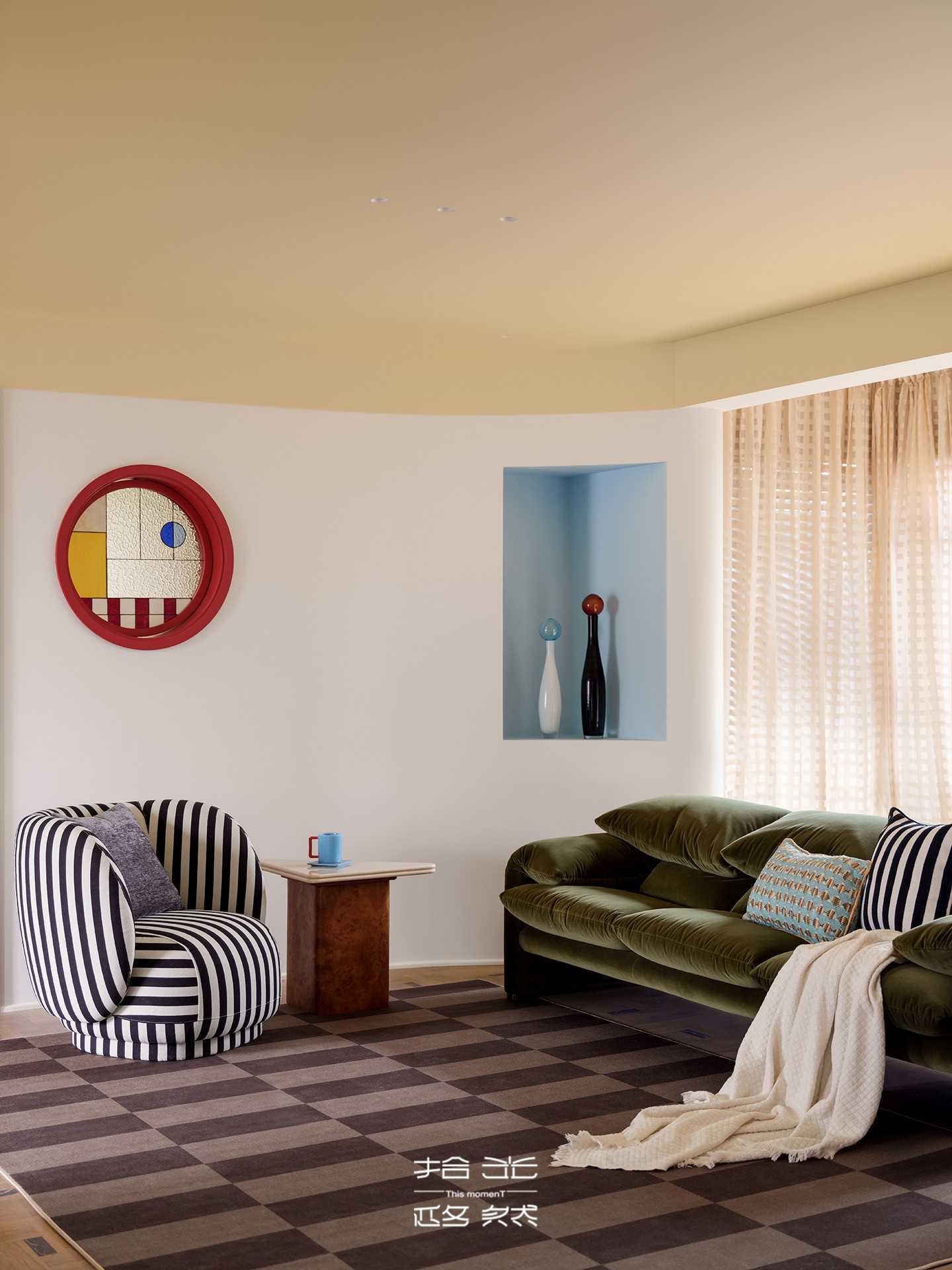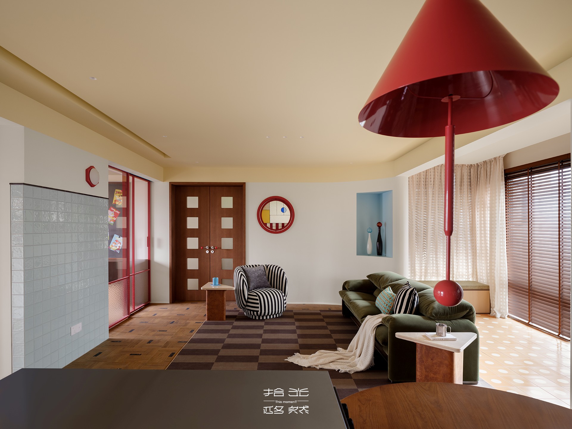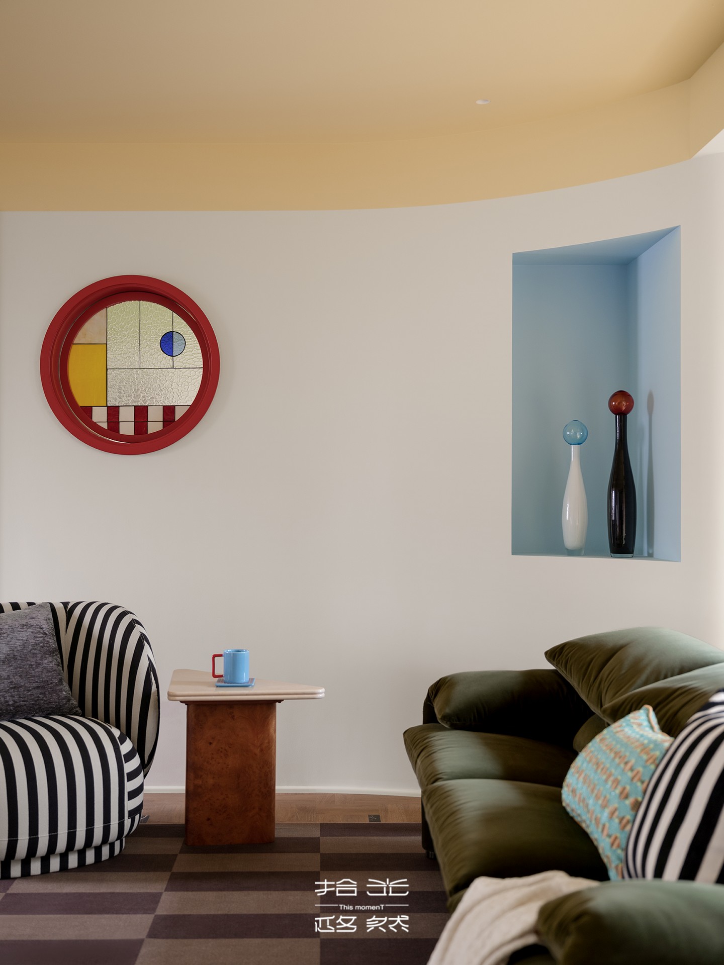 如果设计是一场冒险,我们的家无疑是一次驶向色彩与趣味深处的大胆航行。但比天马行空的想法更珍贵的,是把想象稳稳安放进120平米现实框景里的决心。 这个故事的开端有些特别。我家尚未动工的效果图,就已在某平台里小范围流传,甚至被一些同行拿去,尝试用AI生成类似的“概念”。但当绚丽的色彩与几何在虚拟中碰撞时,我们一家三口,正与设计师@朵朵 一起,面对着施工图上最现实的尺寸、材料和工艺。 一场关于“孟菲斯”风格的大胆实验,就此启幕。我负责硬核的施工落地与质量把控,妻子负责守护她心心念念的视觉与趣味,而设计师朵朵与执行师,则成为了那个最关键的“翻译官”与“合伙人”,将那个几乎被当作「概念素材」的灵感,一砖一瓦,还原为我们触手可及的日常。