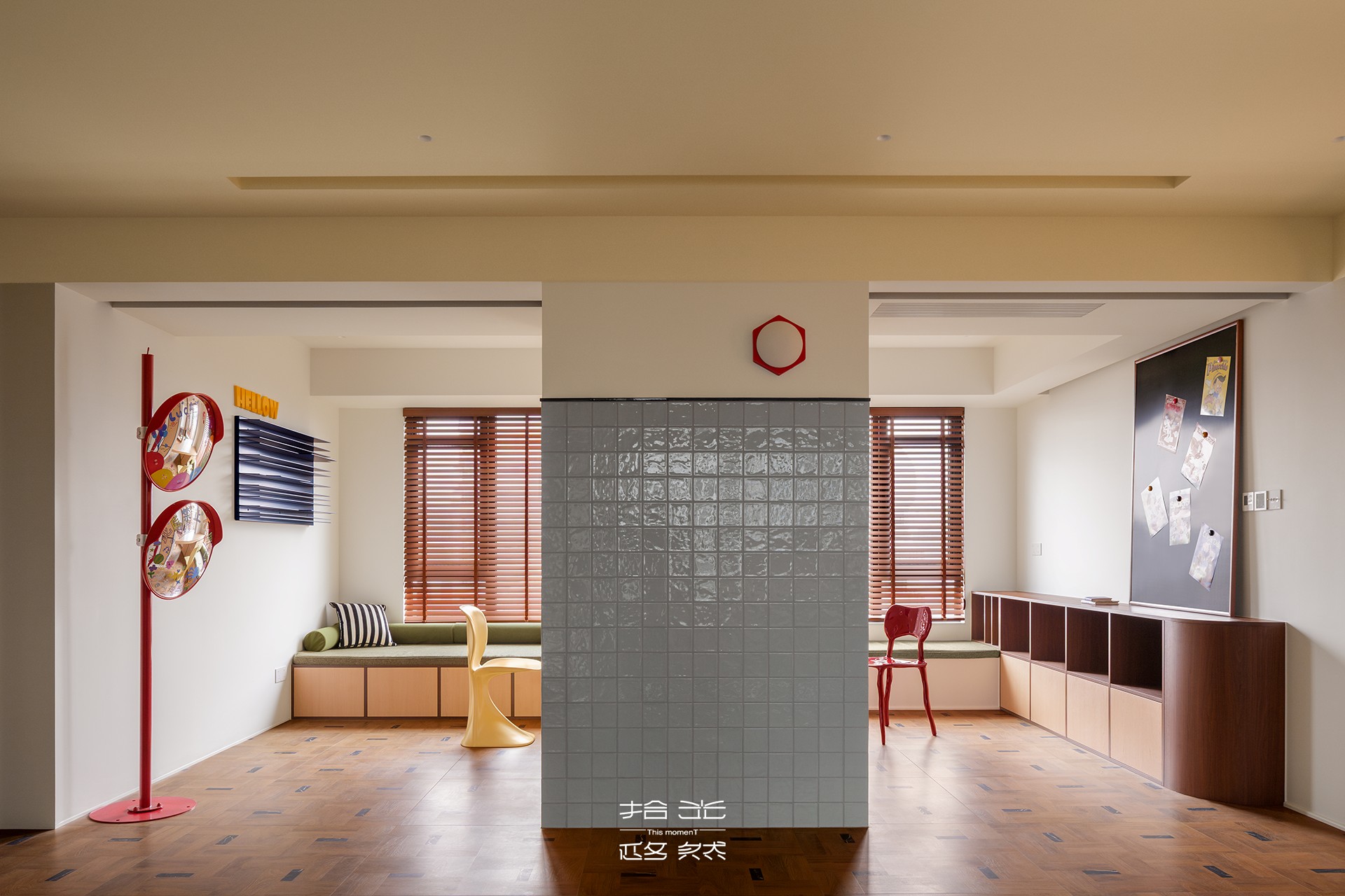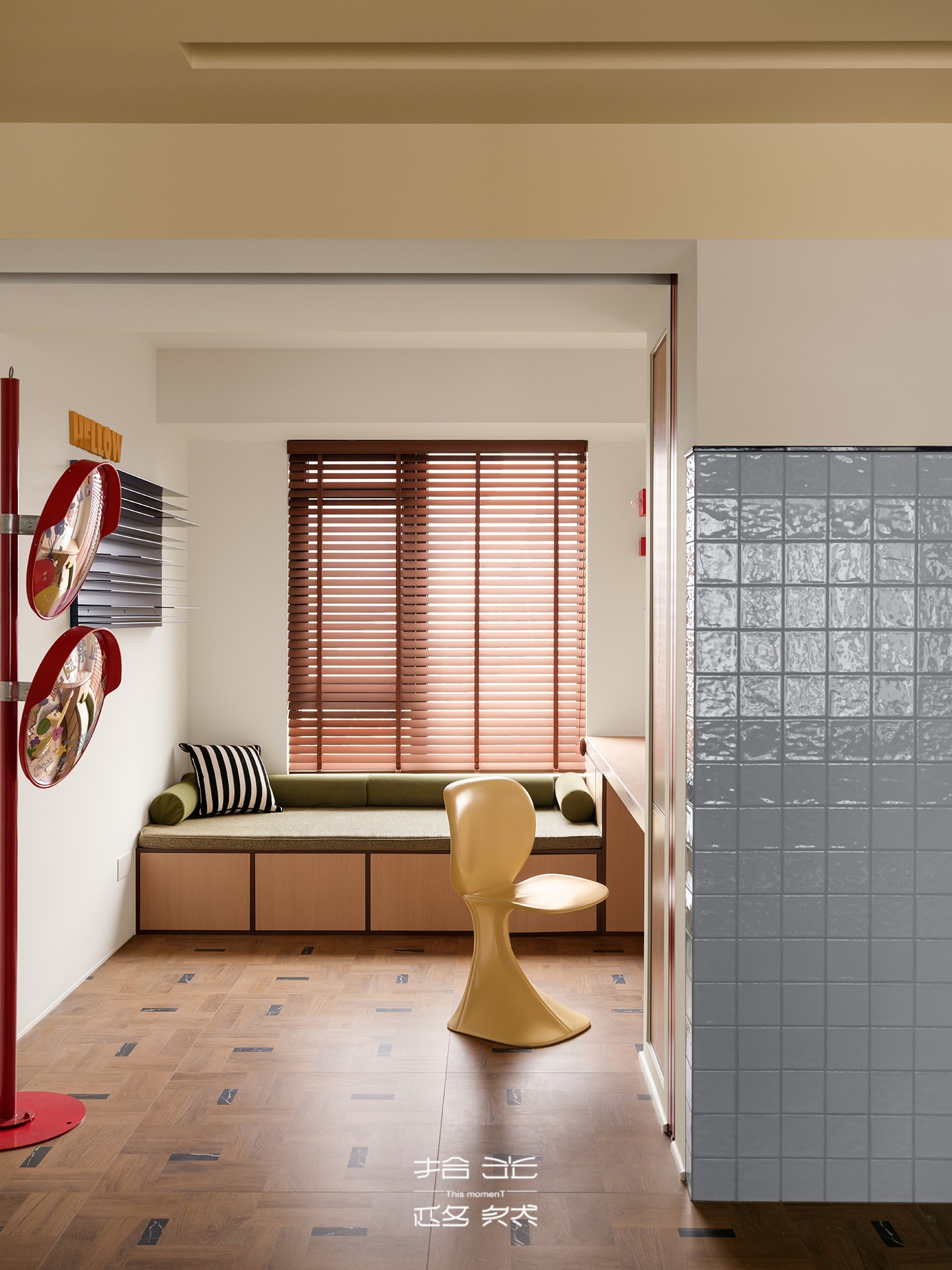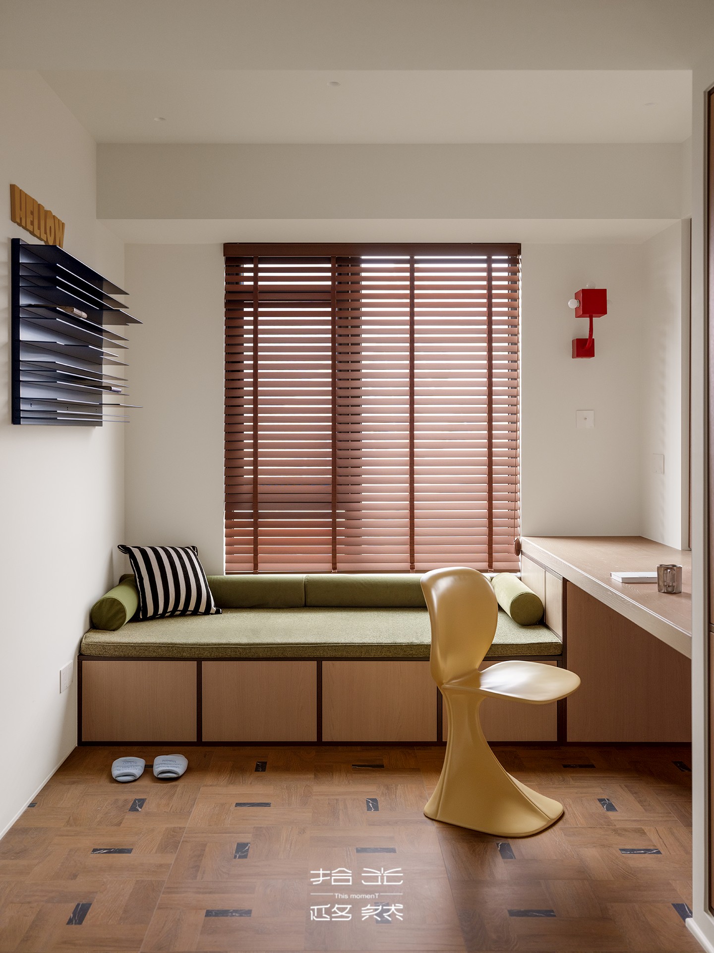 为了保持通透感,设计师用了趣味十足的圆形窗和半通透的双开门。这圆窗像空间的眼睛,而半通透的双开门则巧妙平衡了开阔与隐私。当一家人各自在空间活动时,既能相互感知,又互不打扰。