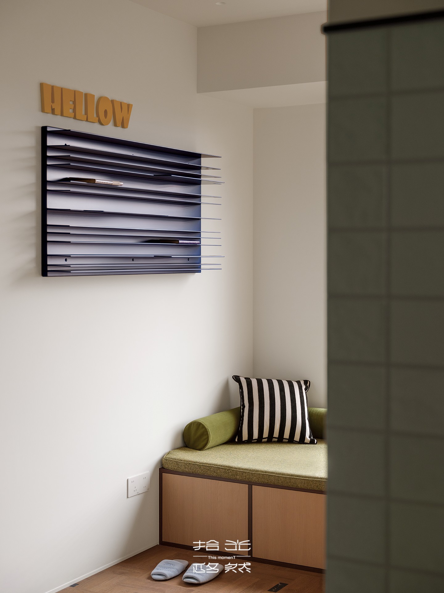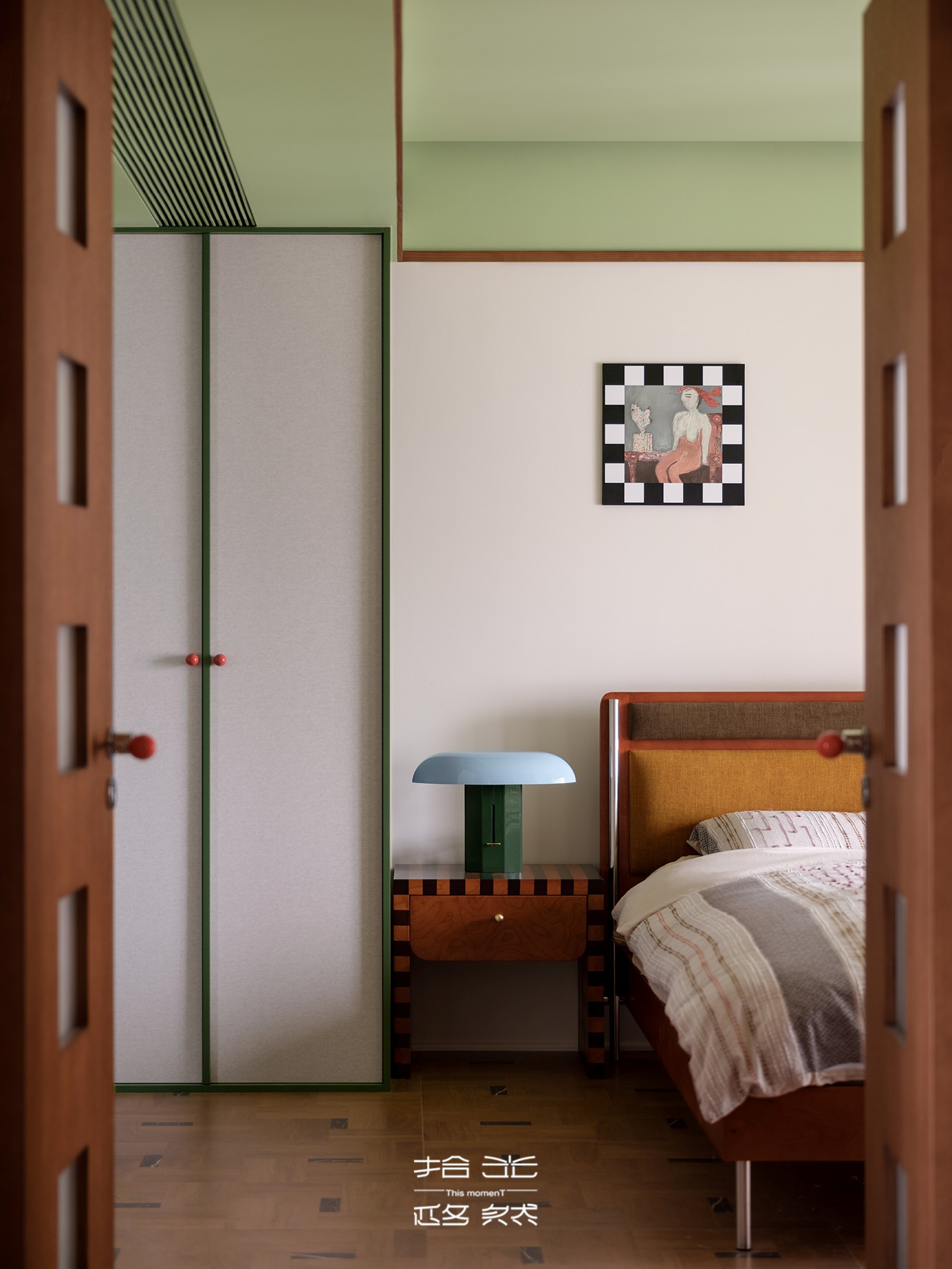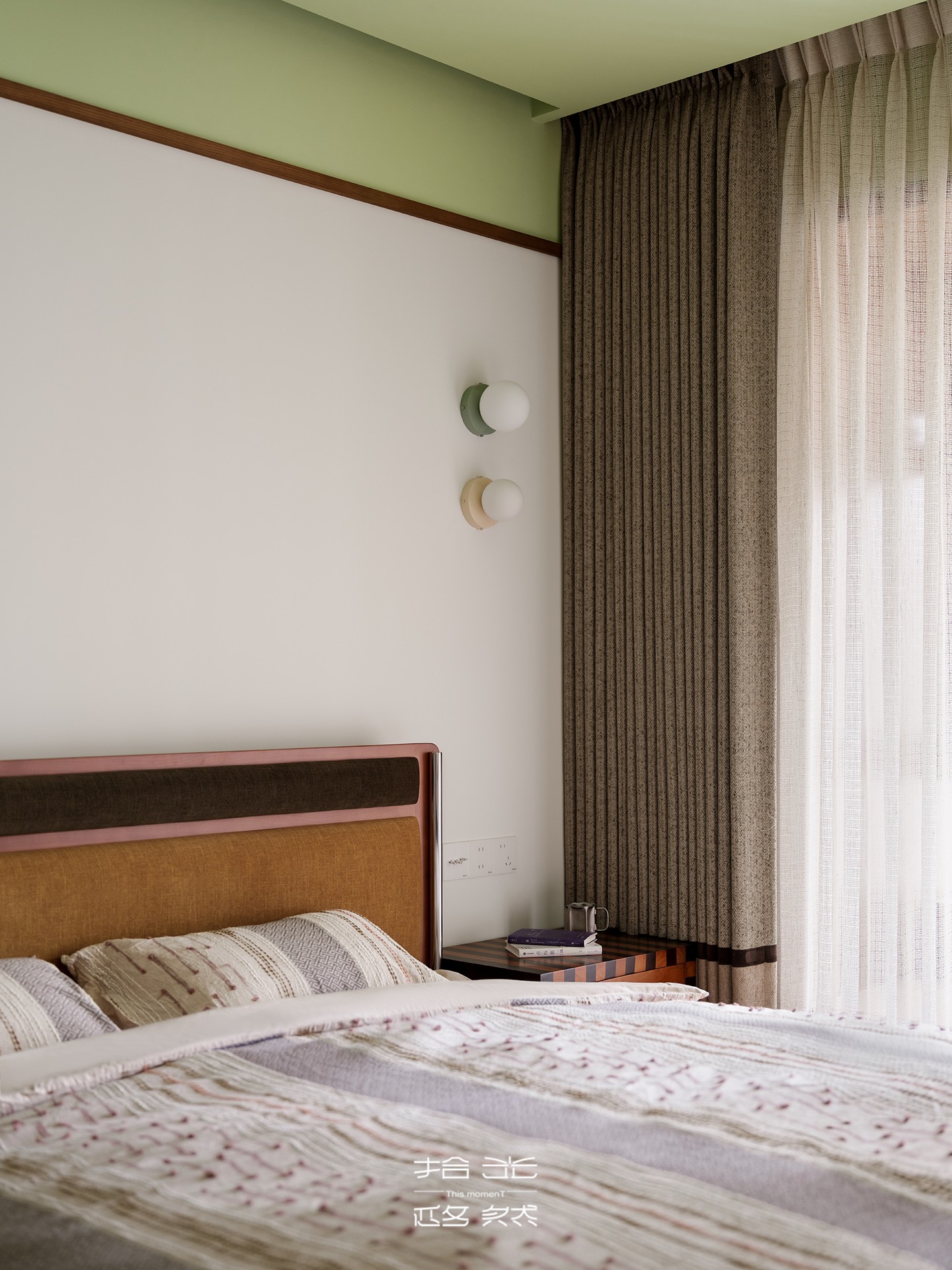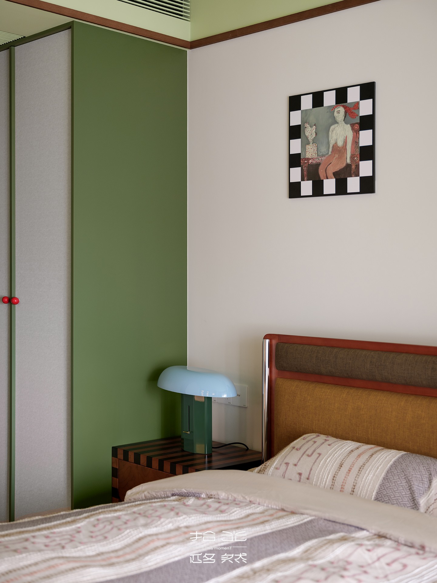 空间情绪从公共区的明快,过渡到这里的私密宁静。睡眠区以不同层次的绿色为主,柚木材质带来温润感。墙面用细窄线条做不对称分层,让简单的墙面也有了立体节奏。