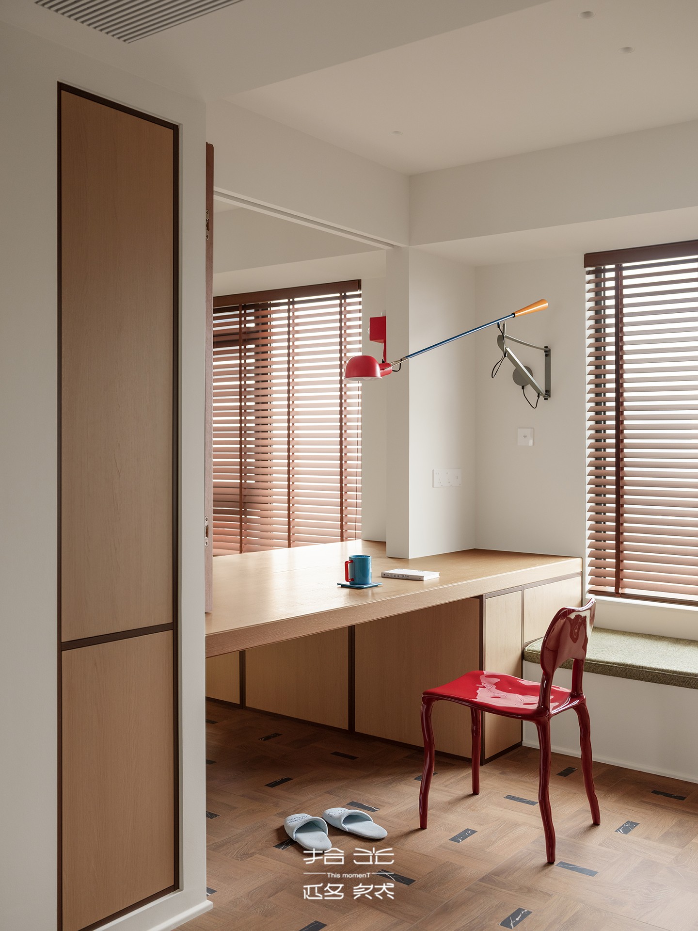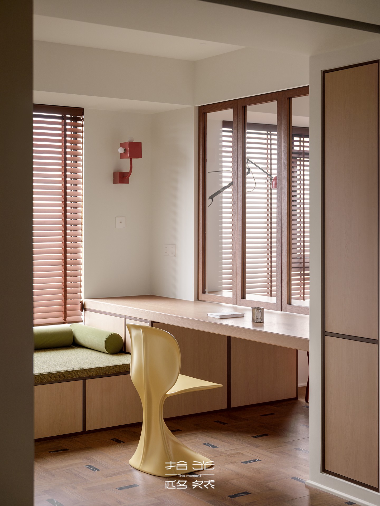 打开时,是一个开阔的共享空间;关闭时,是两个独立的静谧天地。定制的大书桌中间用折叠窗扇划分,能灵活调整。