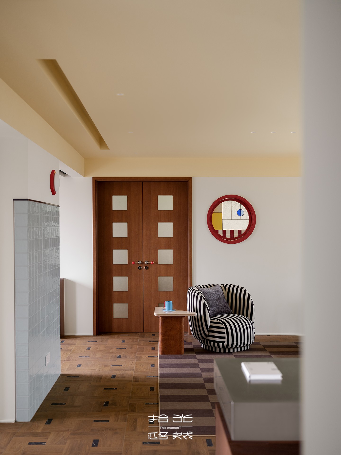 多样的几何形态在这里尽情游戏。经典的方格瓷砖、弧形的门洞线条,与客厅的圆形窗洞遥相呼应。最让人会心一笑的,是那扇包裹着黑白手工马赛克的门框——它让一扇普通的门变成了精致的立体画,每次推开,都像触碰一件艺术品。橱柜与餐厅的柜体采用相同材质,视觉上的统一让餐厨空间浑然一体。