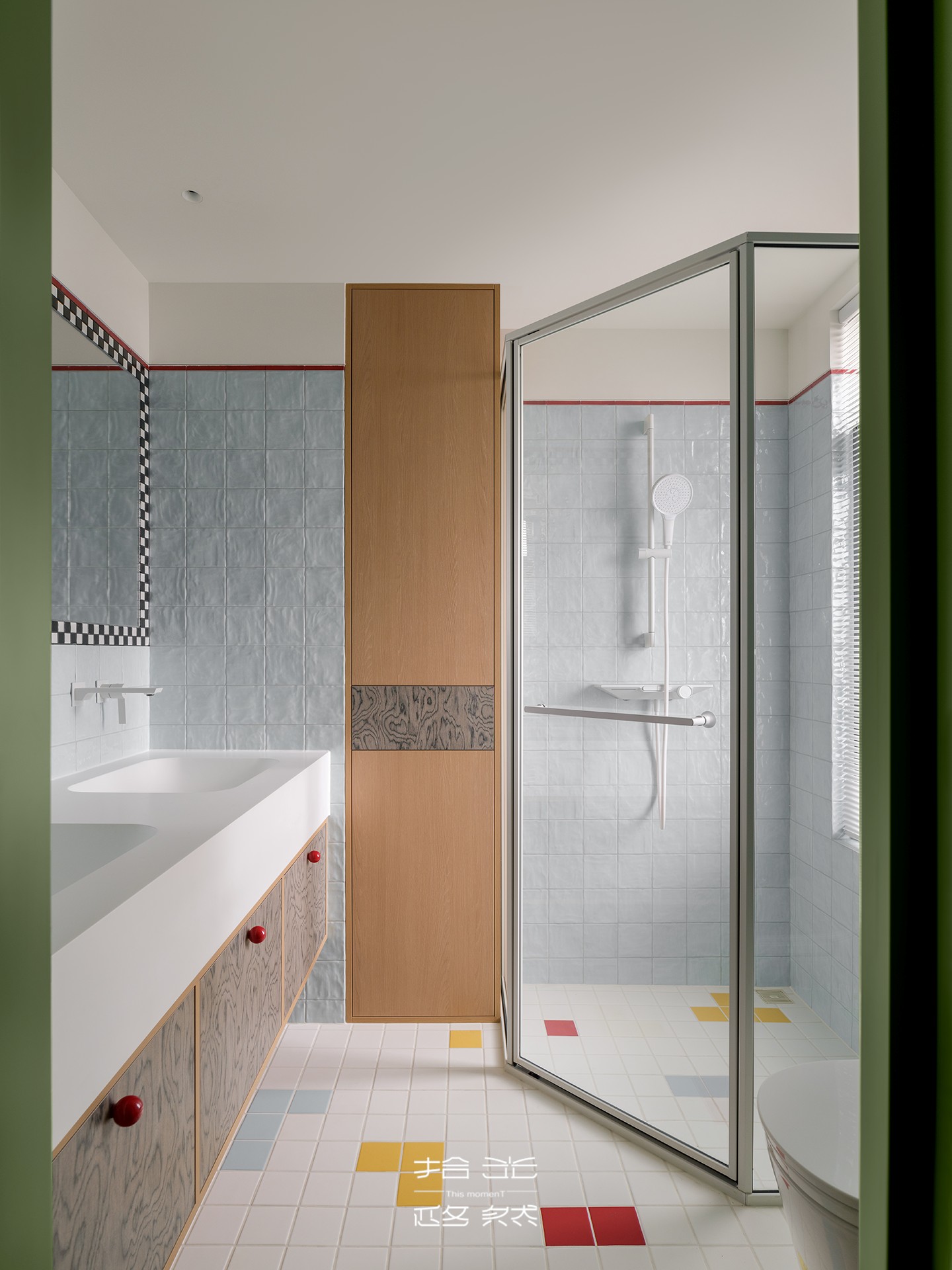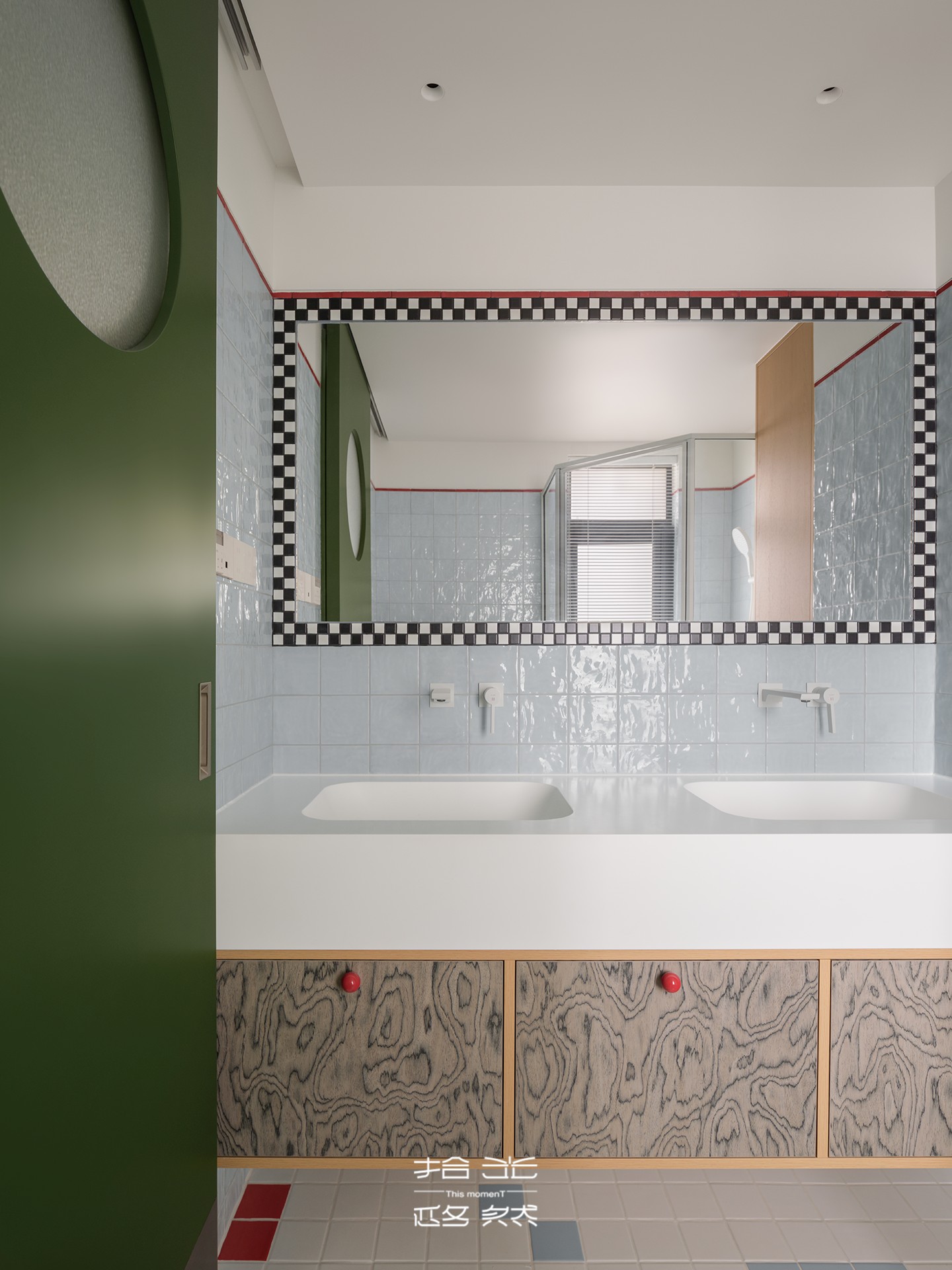 主卫选用了蓝色小方砖来铺就墙面和地面,与红色装饰条激烈碰撞,充满戏剧性,又在其他色彩的调和下回归和谐。双台盆的设计,是我和妻子早晨洗漱时不“打架”的温柔,就连洗漱镜也是采用厨房门框同款的马赛克制作边框,细节中有带我们好玩的感觉。