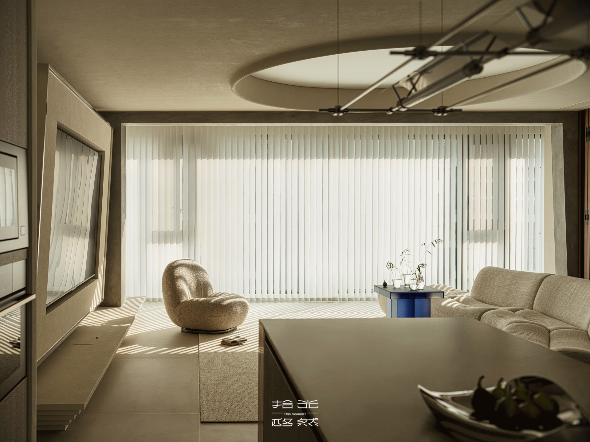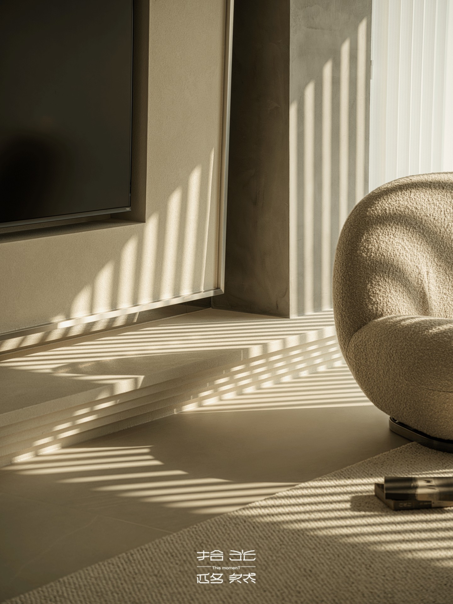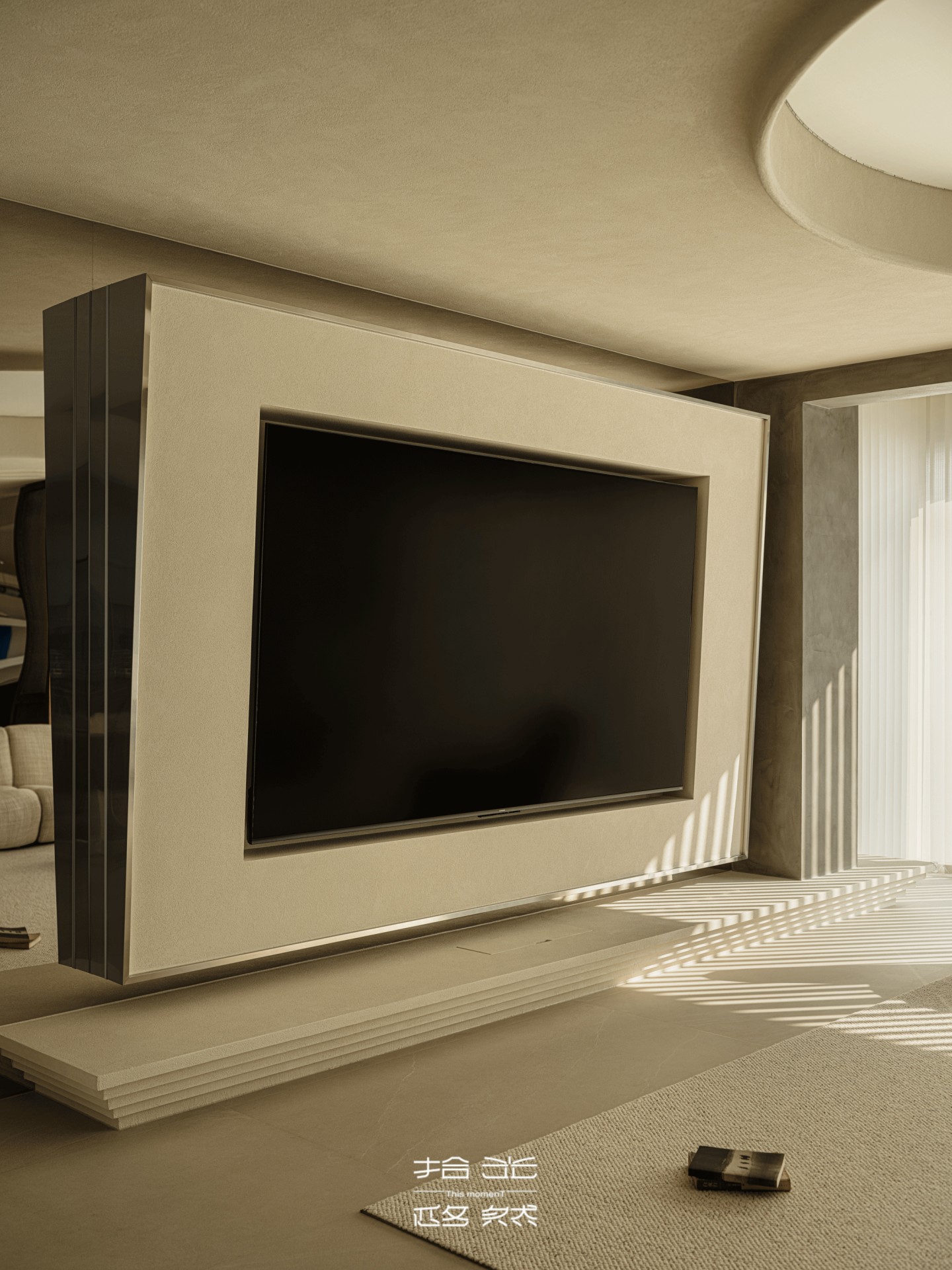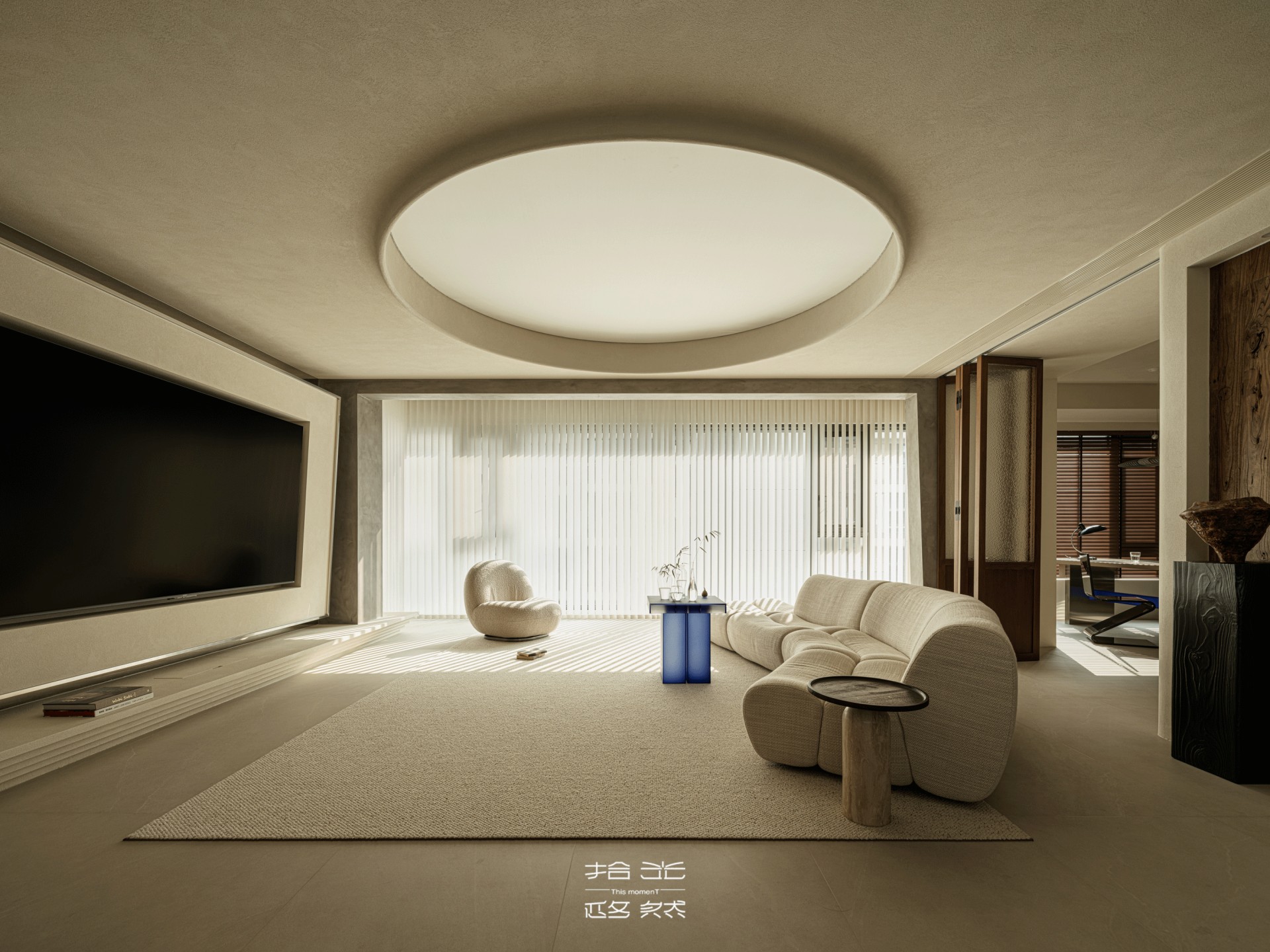 客厅的光,是梦幻帘酿出的温柔——从旷野拽来的肌理裹在墙面,弧形顶面像把沙海的起伏轻轻扣在了头顶,梦幻帘将日光滤成朦胧的沙色柔光,不似百叶的细碎切割,而是让光线顺着帘的褶皱缓缓淌进空间,落在地板上时,像沙海的波纹轻轻晃,连宝宝爬过的掌印都裹着软乎乎的暖,朦胧又治愈。