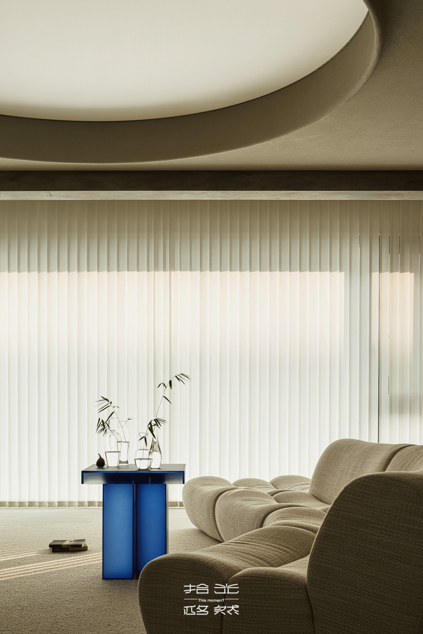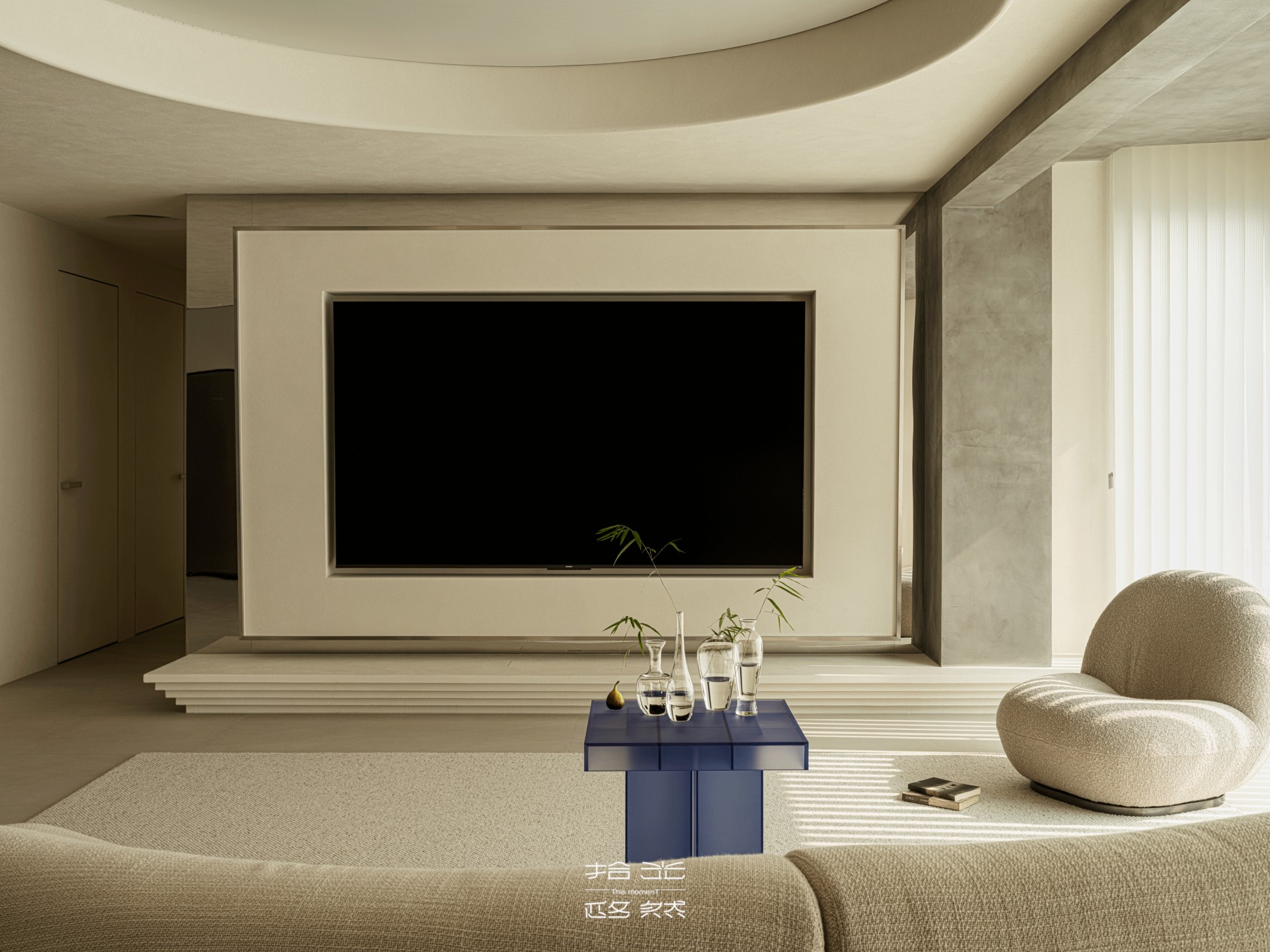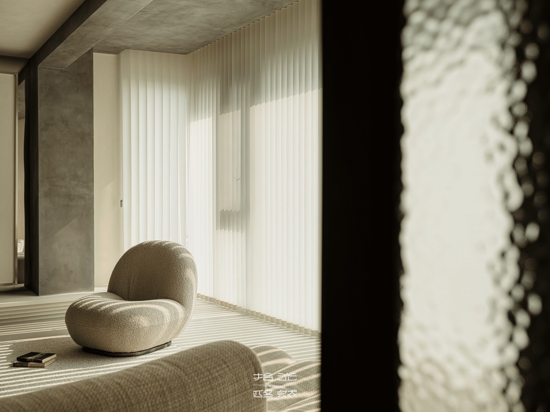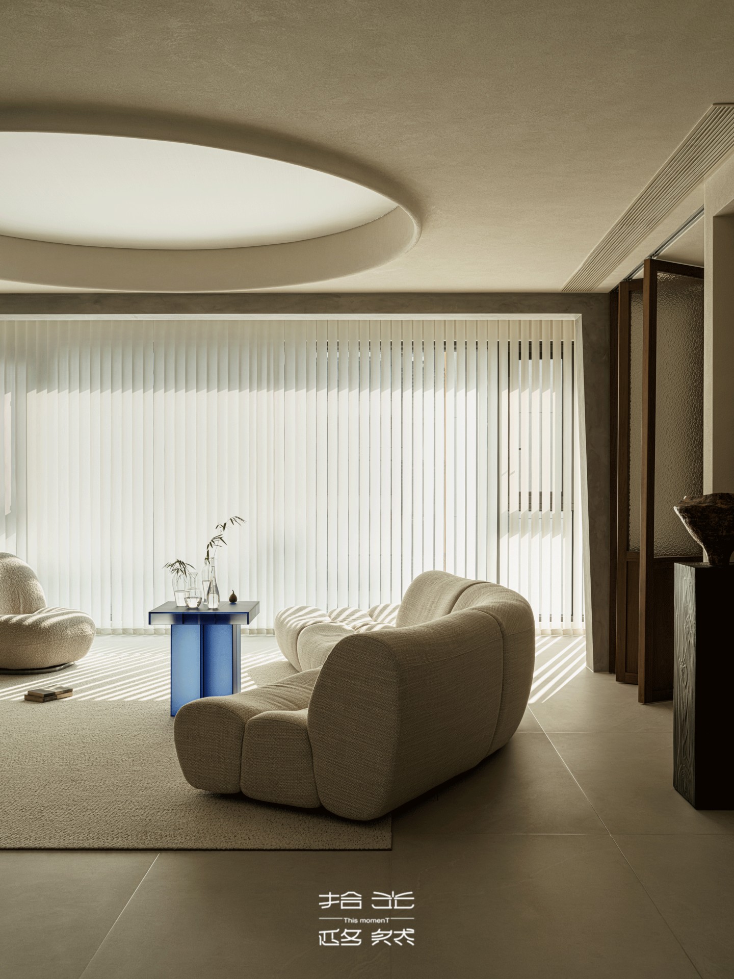 客厅的光,是梦幻帘酿出的温柔——从旷野拽来的肌理裹在墙面,弧形顶面像把沙海的起伏轻轻扣在了头顶,梦幻帘将日光滤成朦胧的沙色柔光,不似百叶的细碎切割,而是让光线顺着帘的褶皱缓缓淌进空间,落在地板上时,像沙海的波纹轻轻晃,连宝宝爬过的掌印都裹着软乎乎的暖,朦胧又治愈。
