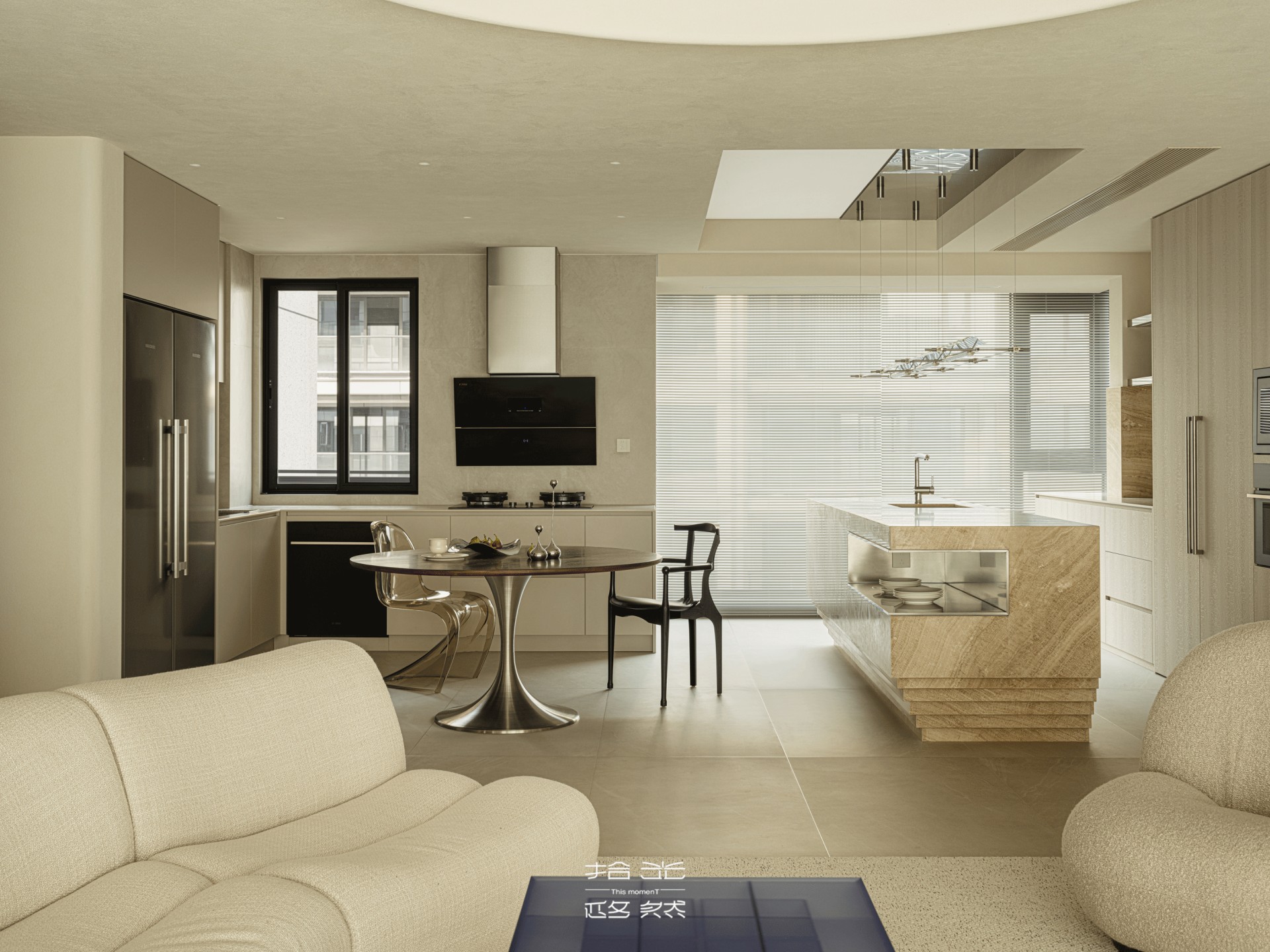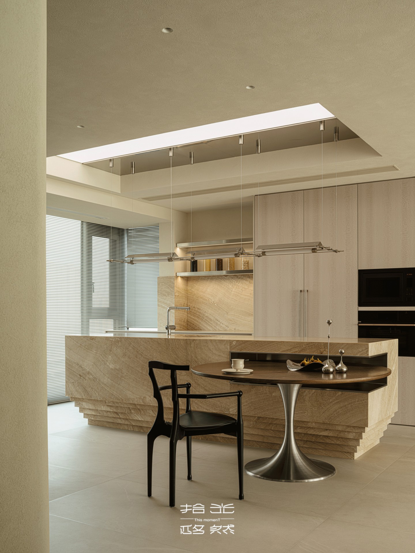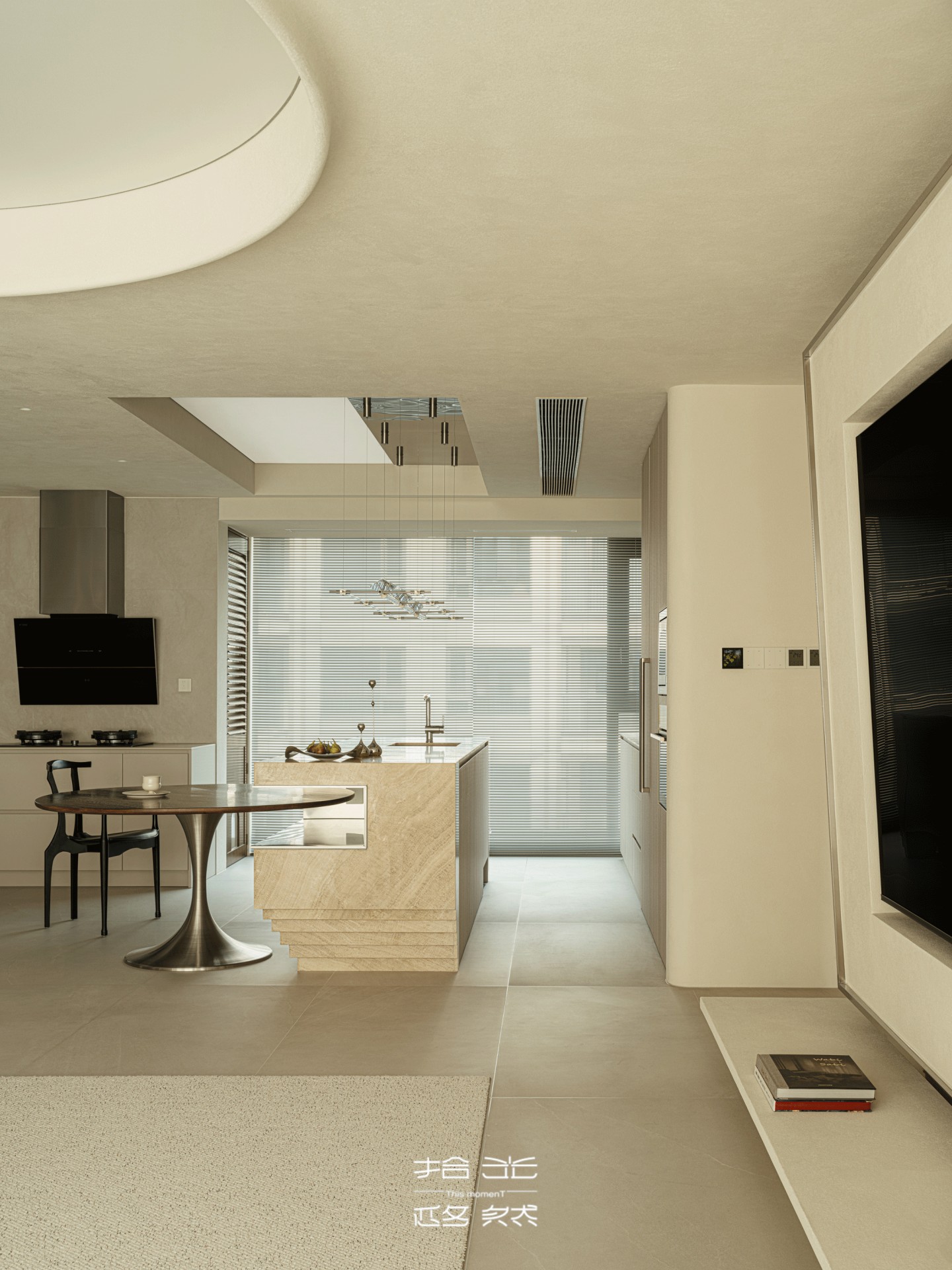顶面的采光口漏下浅淡的光,和罗马帘的柔光缠在一起,落在餐盘边缘时,连饭菜的香气都沾了层暖。橱柜的浅木色顺着沙色肌理延展,与整个空间的温柔浑然一体,原来烟火气与美学从不是对立面,不过是把旷野的温柔,揉进了三餐四季里。