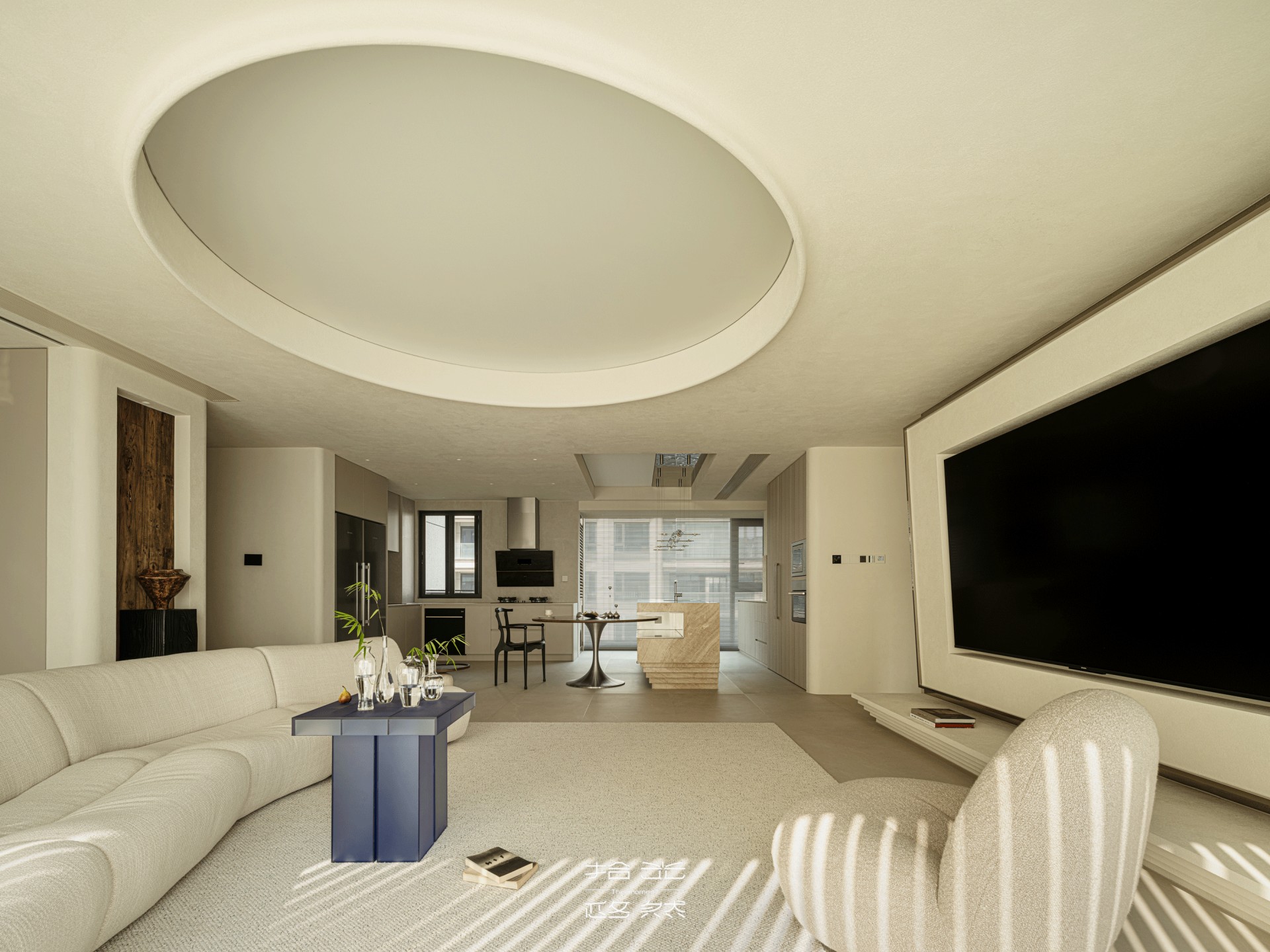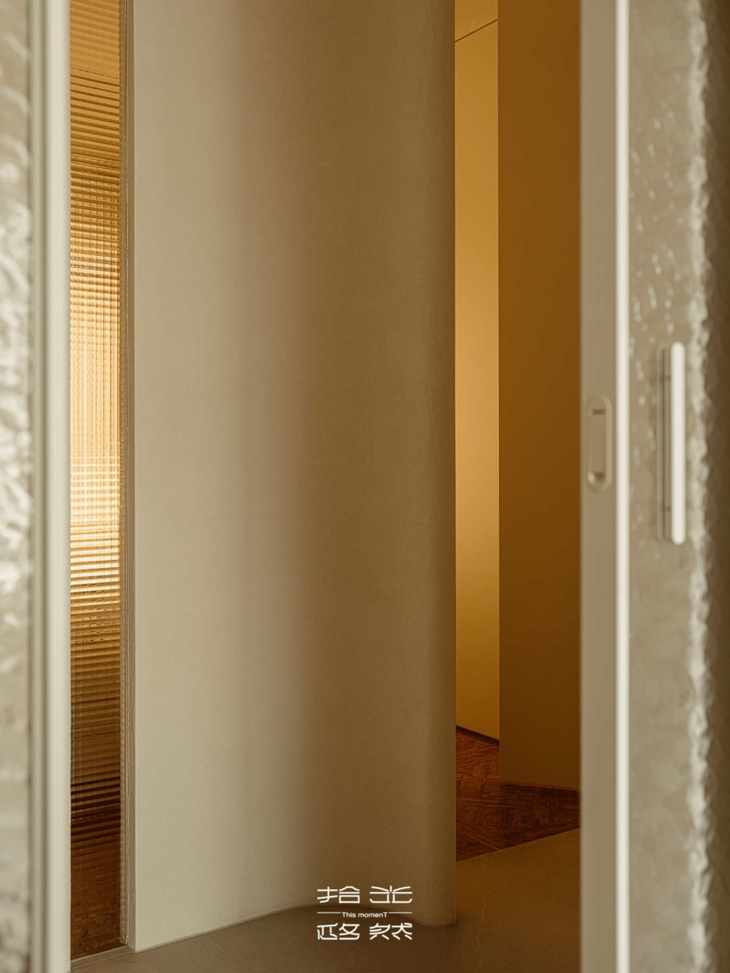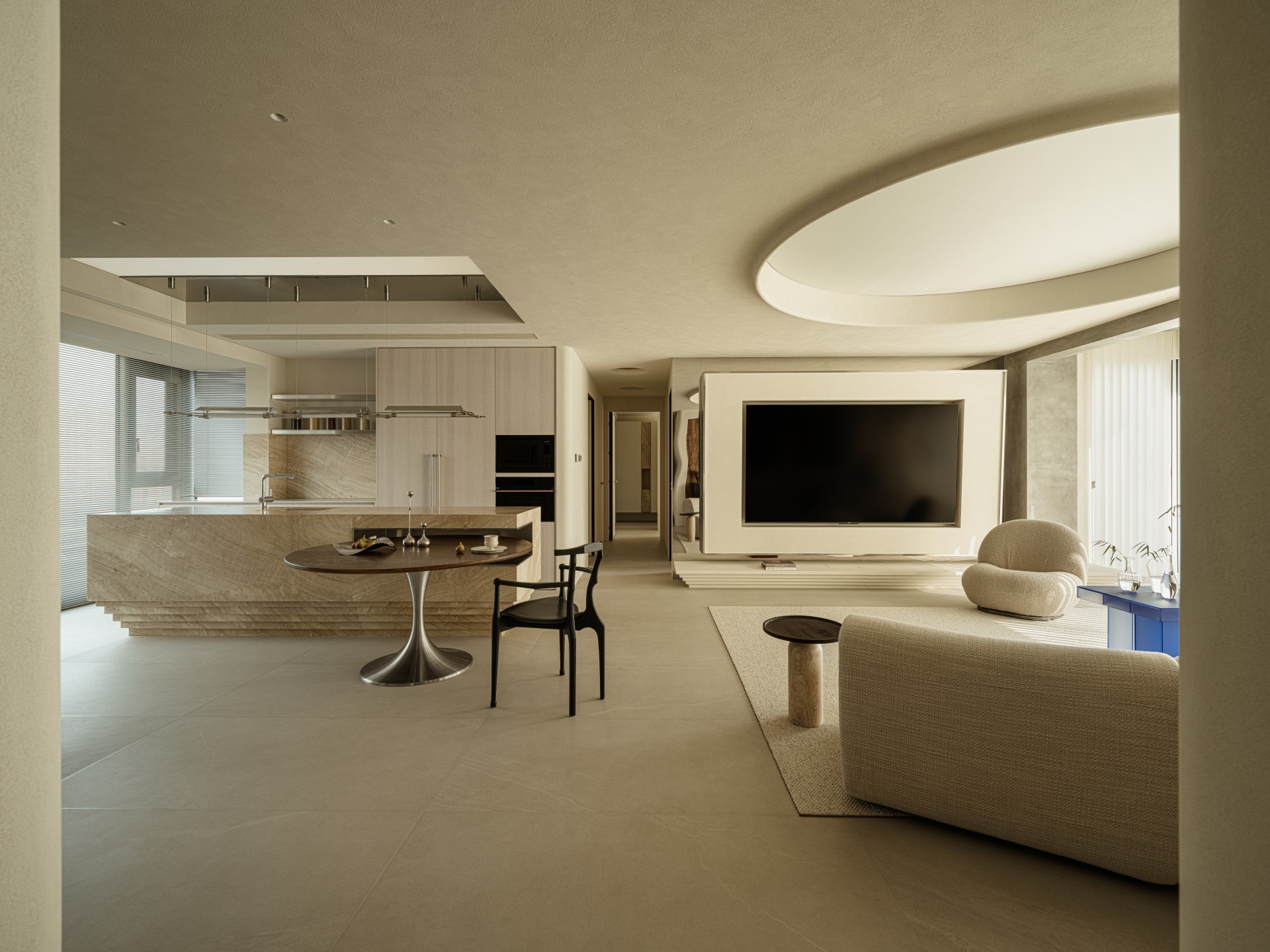 脚步刚越过玄关的莱姆石肌理,视线便被前方缓缓铺展的空间牵住 —— 从竹节排列的东方雅致里抽身,下一秒,便撞进沙海肌理般的温柔开阔里,玄关与客厅的过渡,像一场无声的美学叙事,从归家的精致序章,慢慢淌入生活的松弛主调。