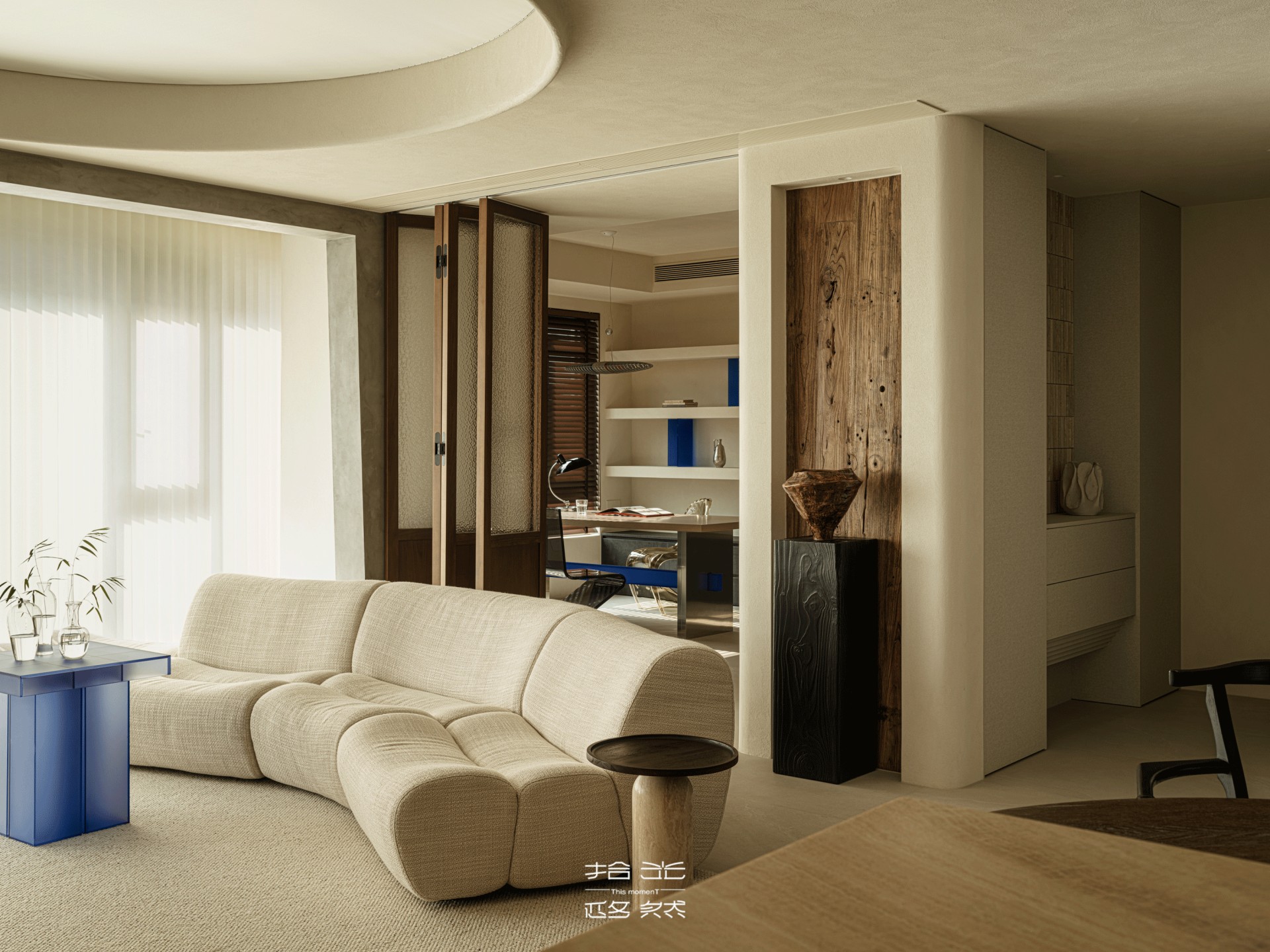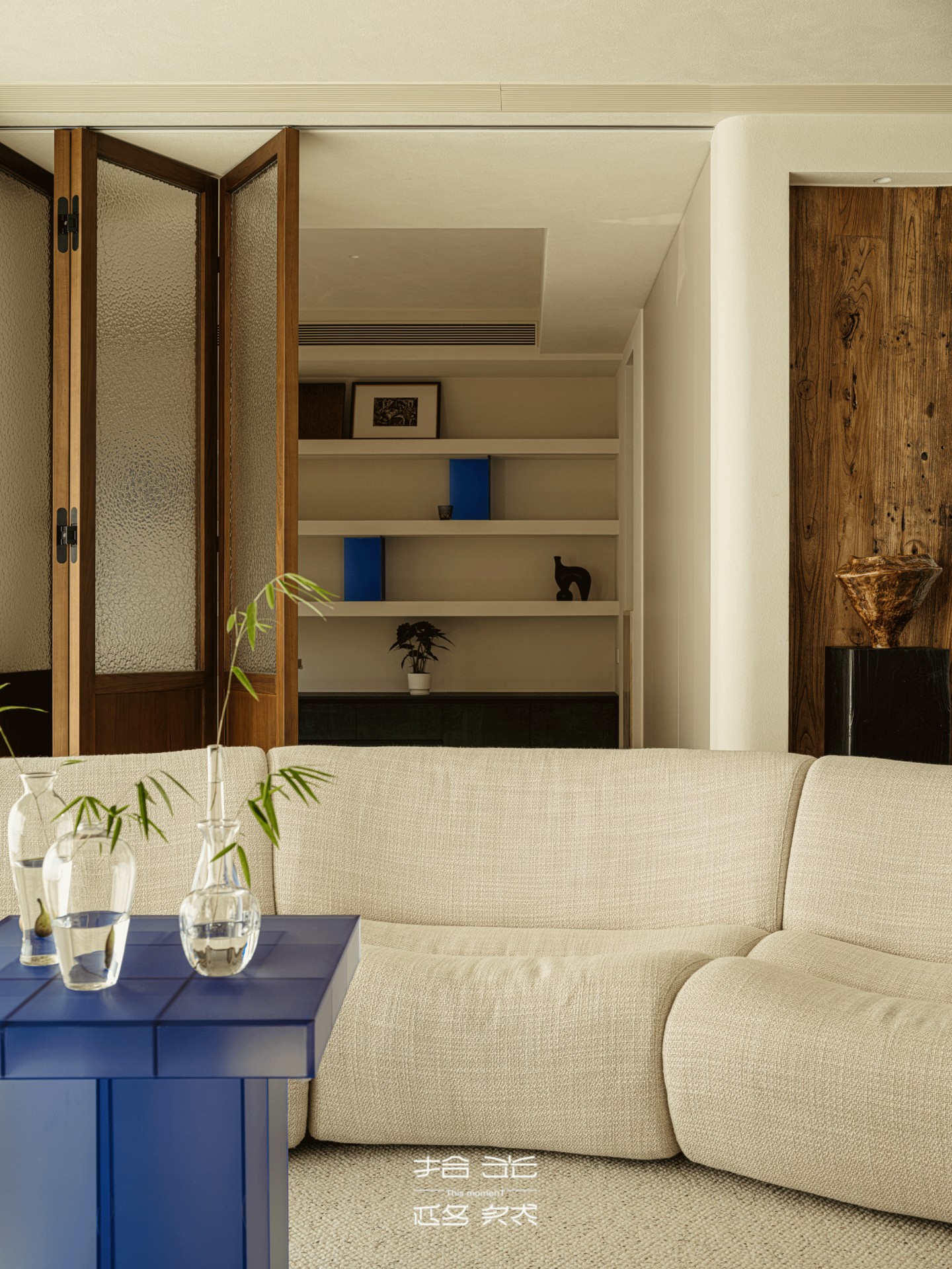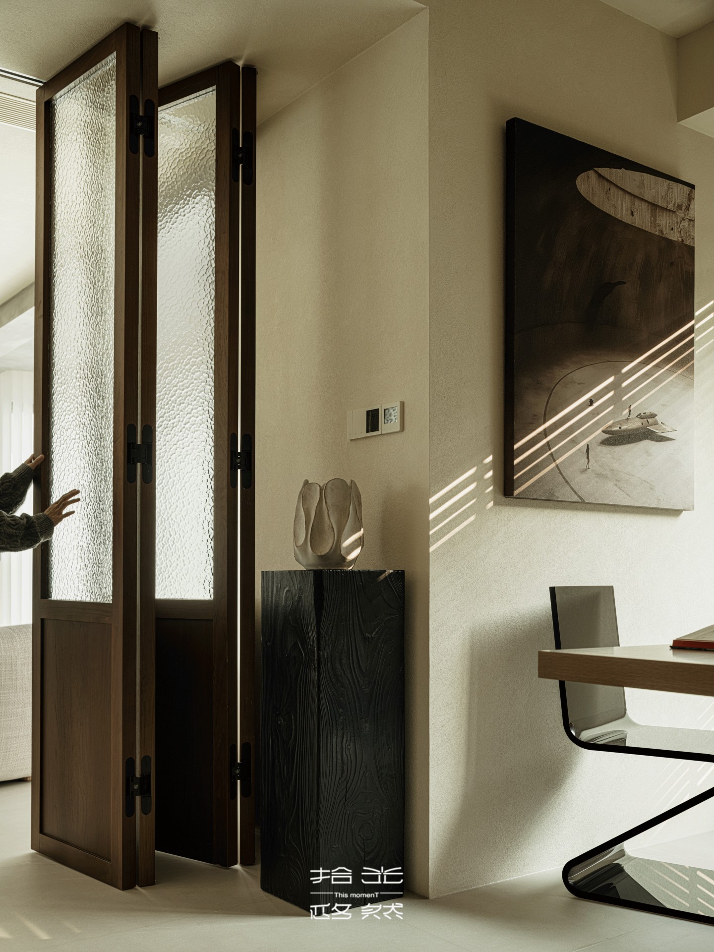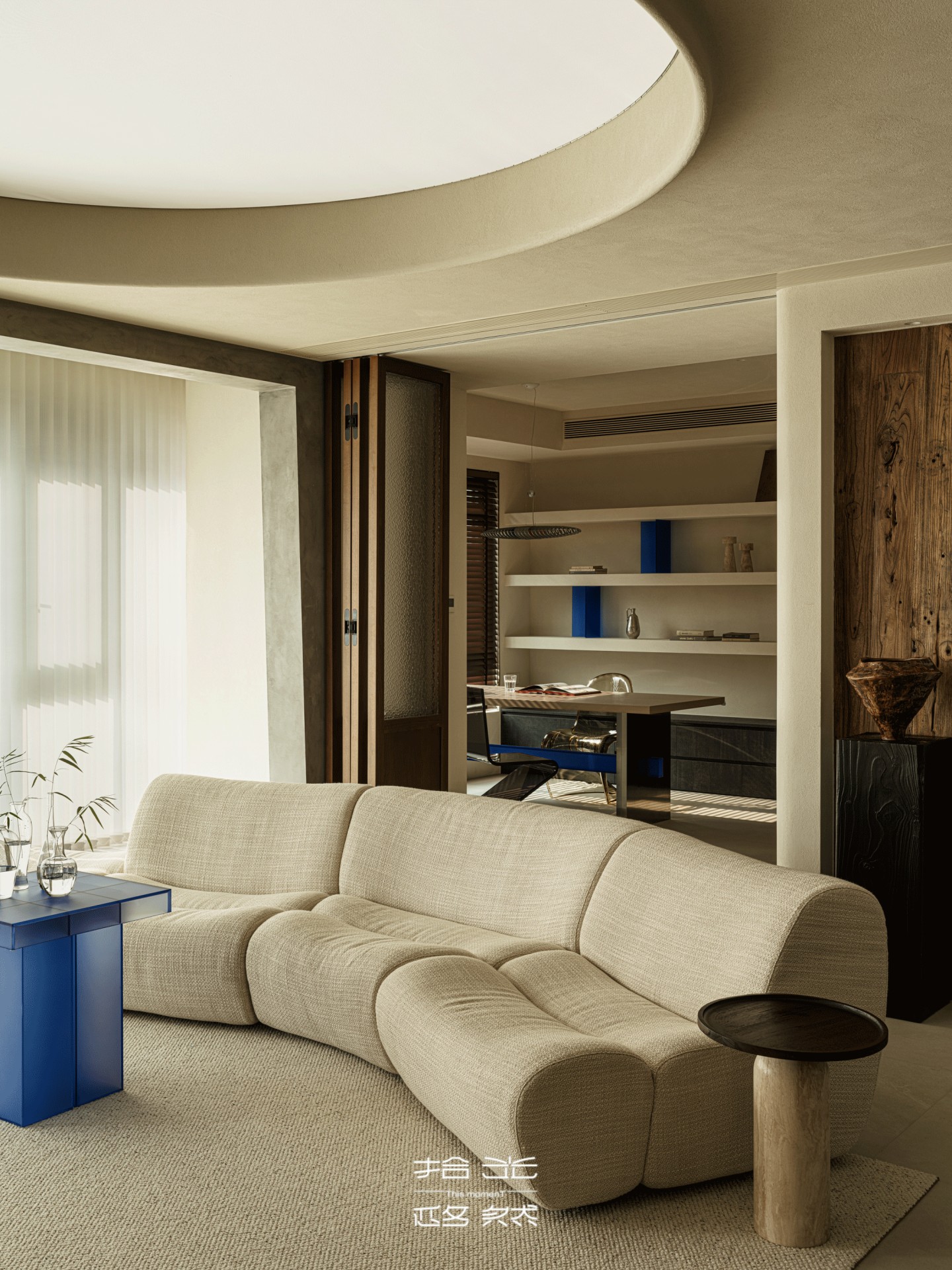 靛蓝边几的跳色,从客厅隐约探向过渡区,像沙海里的晶石,为这份沙色的温柔添了一抹先锋的灵动,与玄关的艺术摆件遥遥呼应,让两个空间的美学脉络,紧紧缠绕。