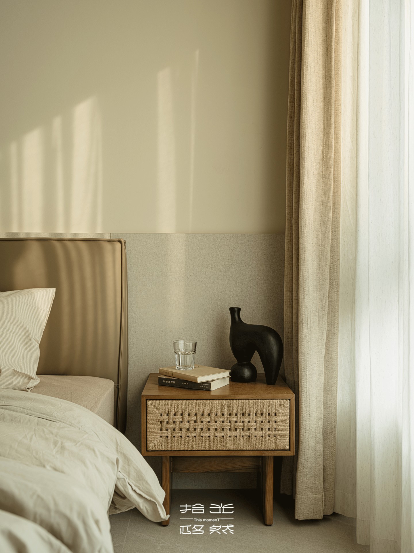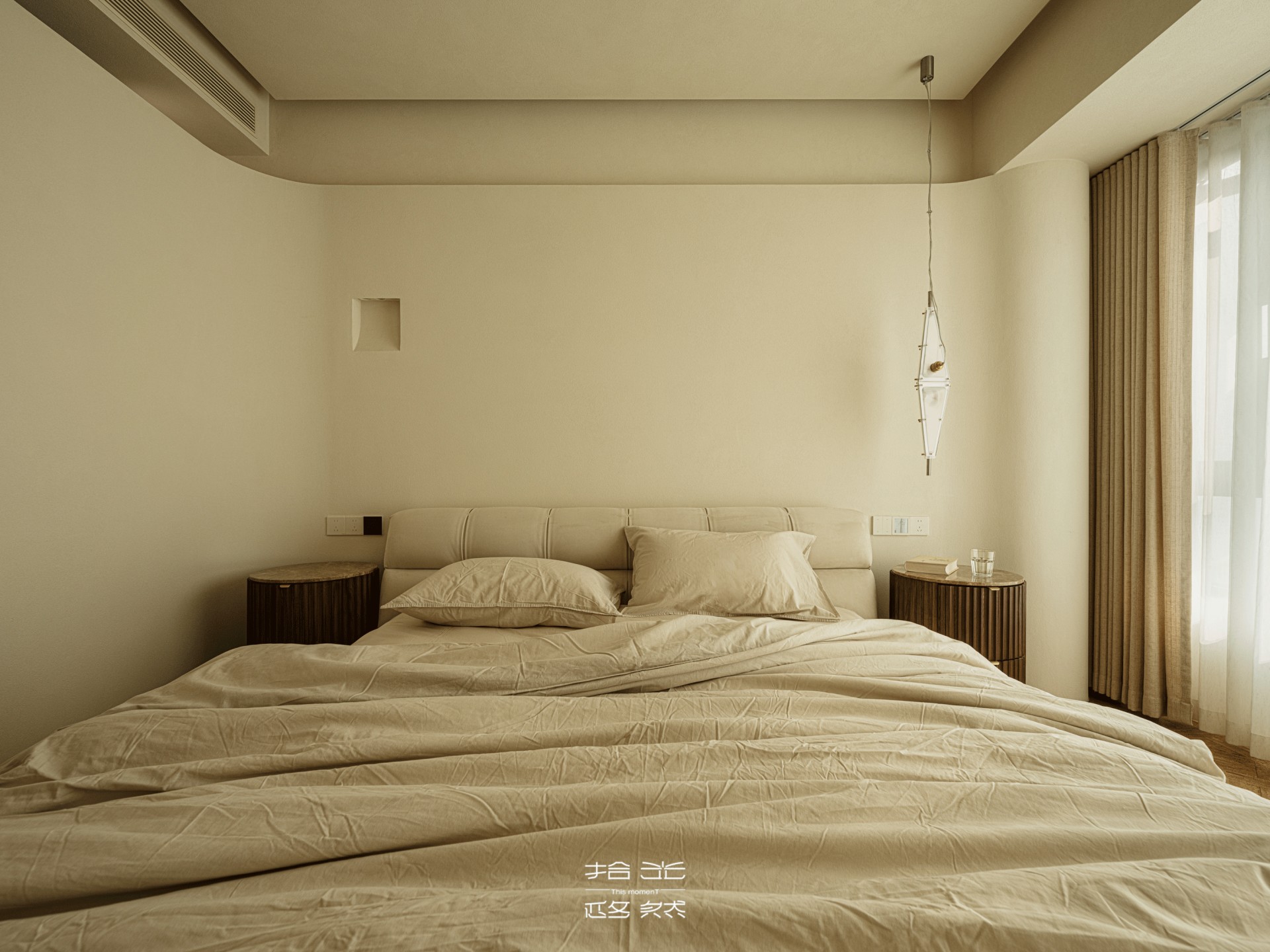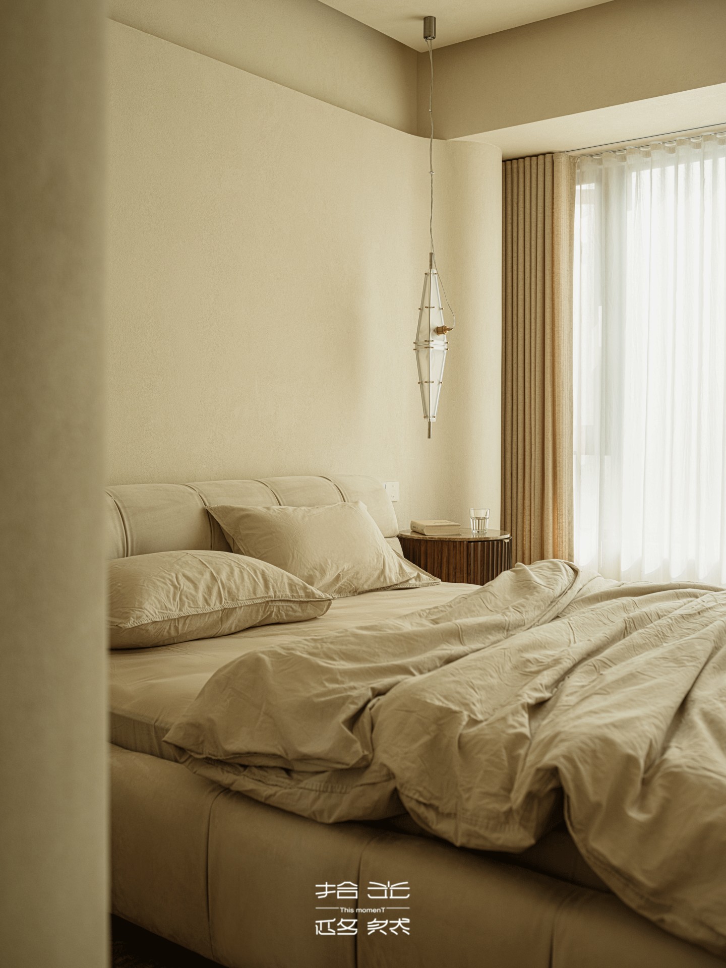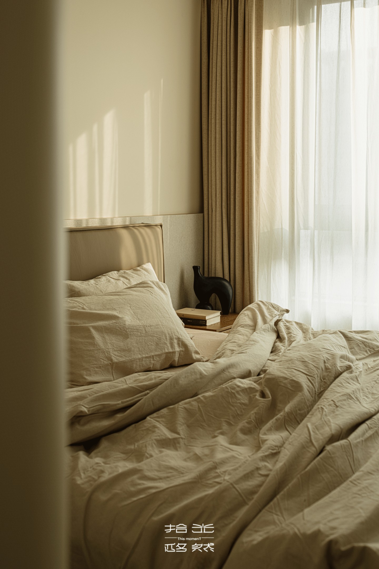 米色与浅灰在墙面上安静拼接,如时光本身的自然分层。阳光被半透的纱帘轻轻筛过,柔柔铺在带着褶皱的床品上,凝出一片柔淡的光斑 —— 时间在此,仿佛被悄悄调慢了流速。