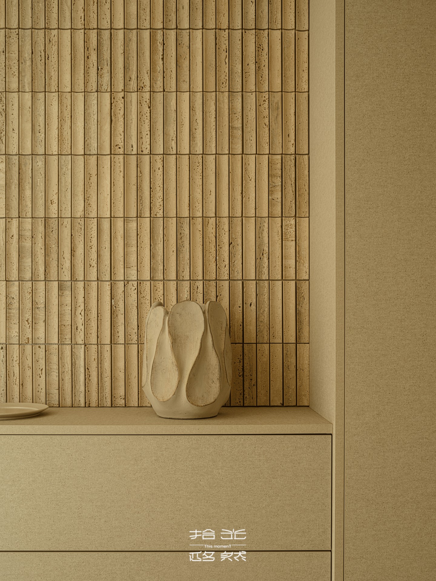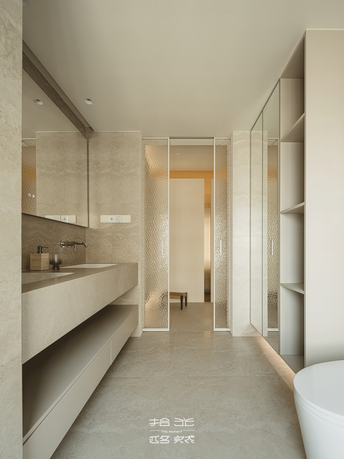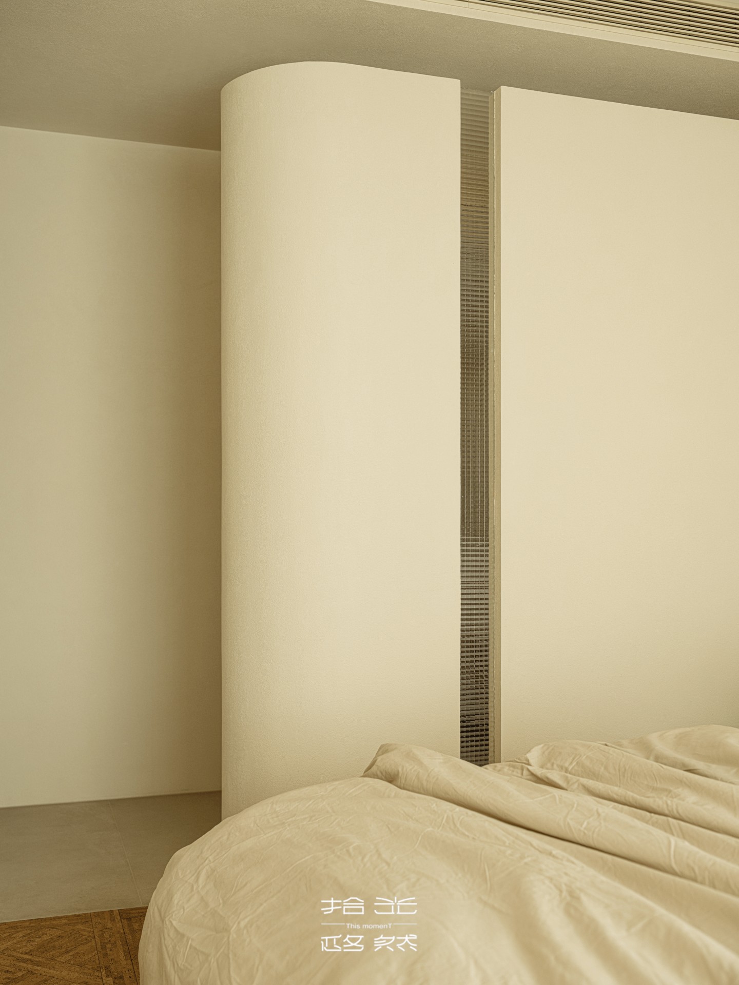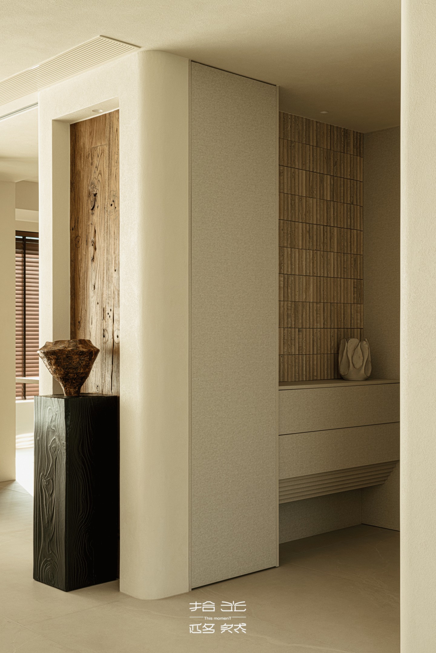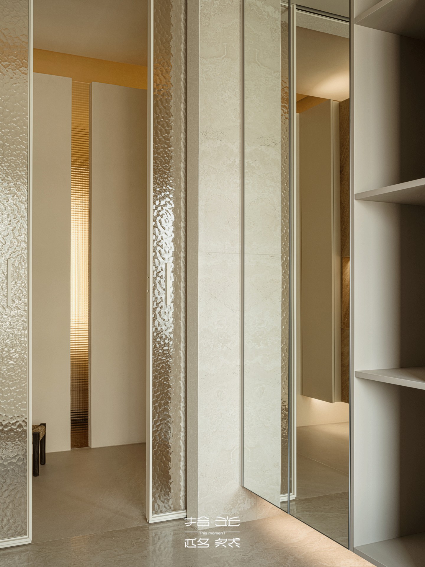 隔断中间的收纳柜,石材表面仿着流动的沙漠纹理,和客厅的美学遥相呼应,放睡衣、宝宝的小被子刚好合适。
