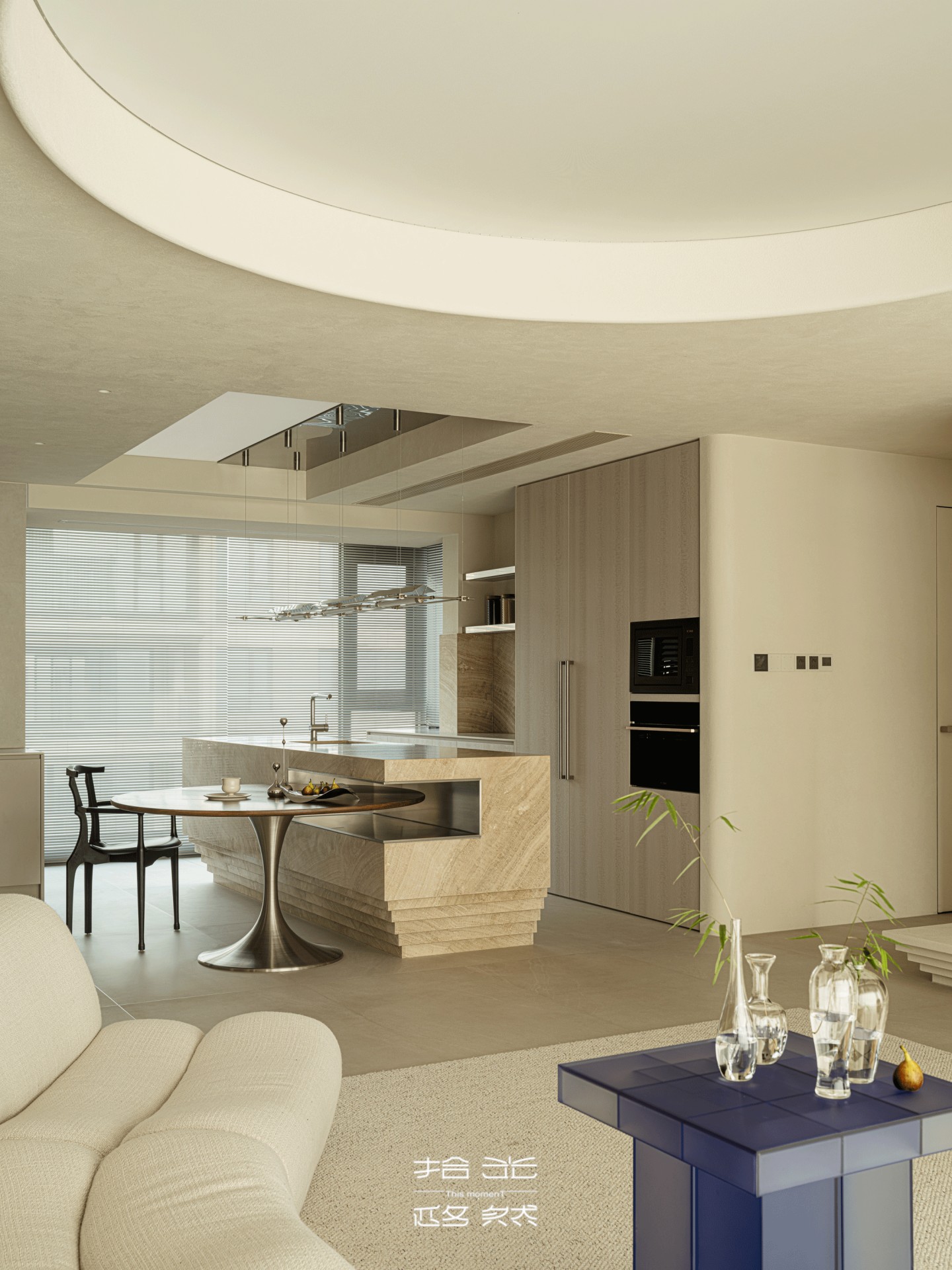 岛台是餐厨区的温柔核心,层叠的沙色石材肌理,和客厅的艺术涂料悄悄呼应,像把旷野的细沙揉进了三餐里。