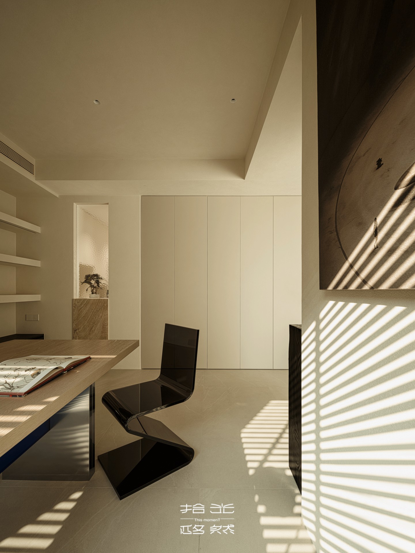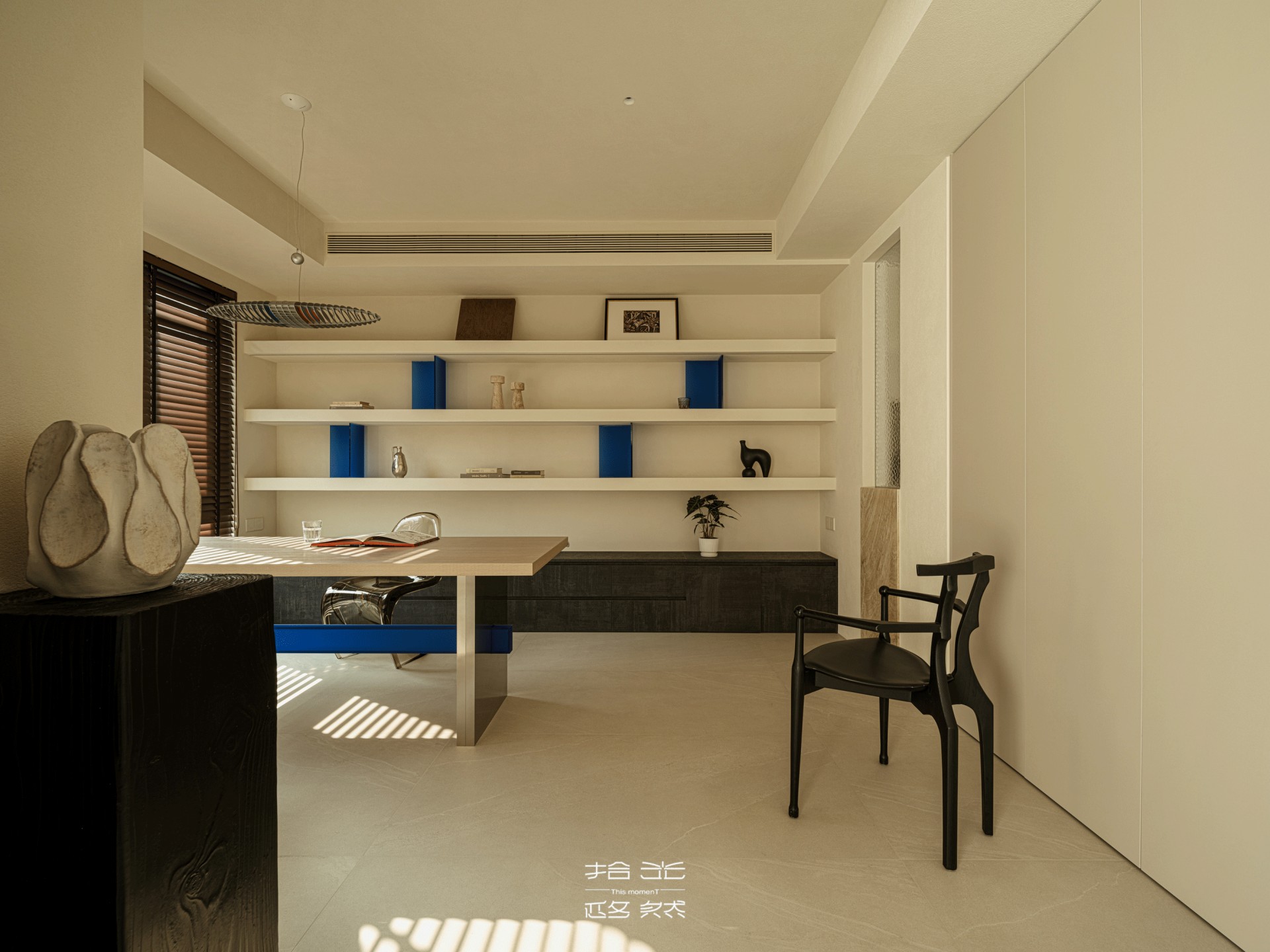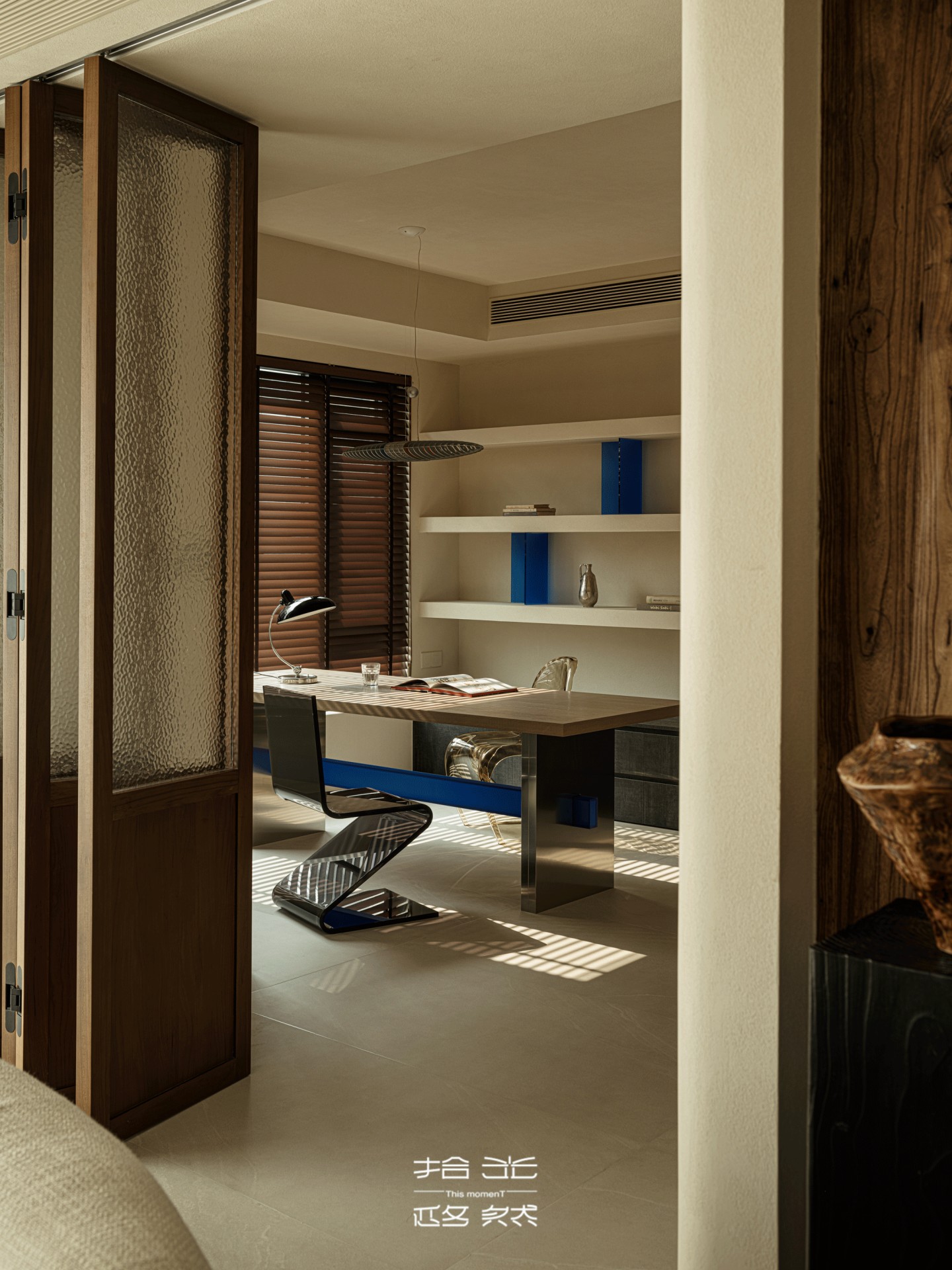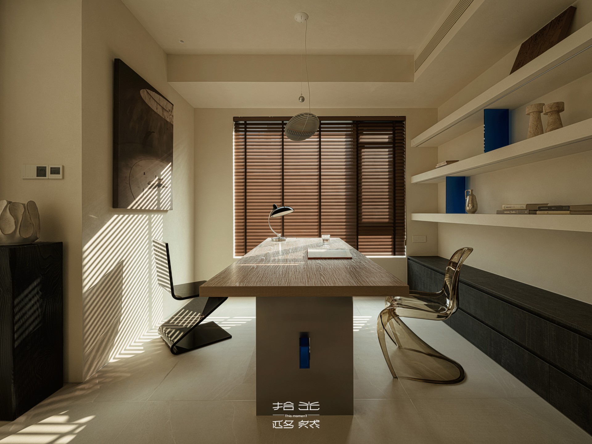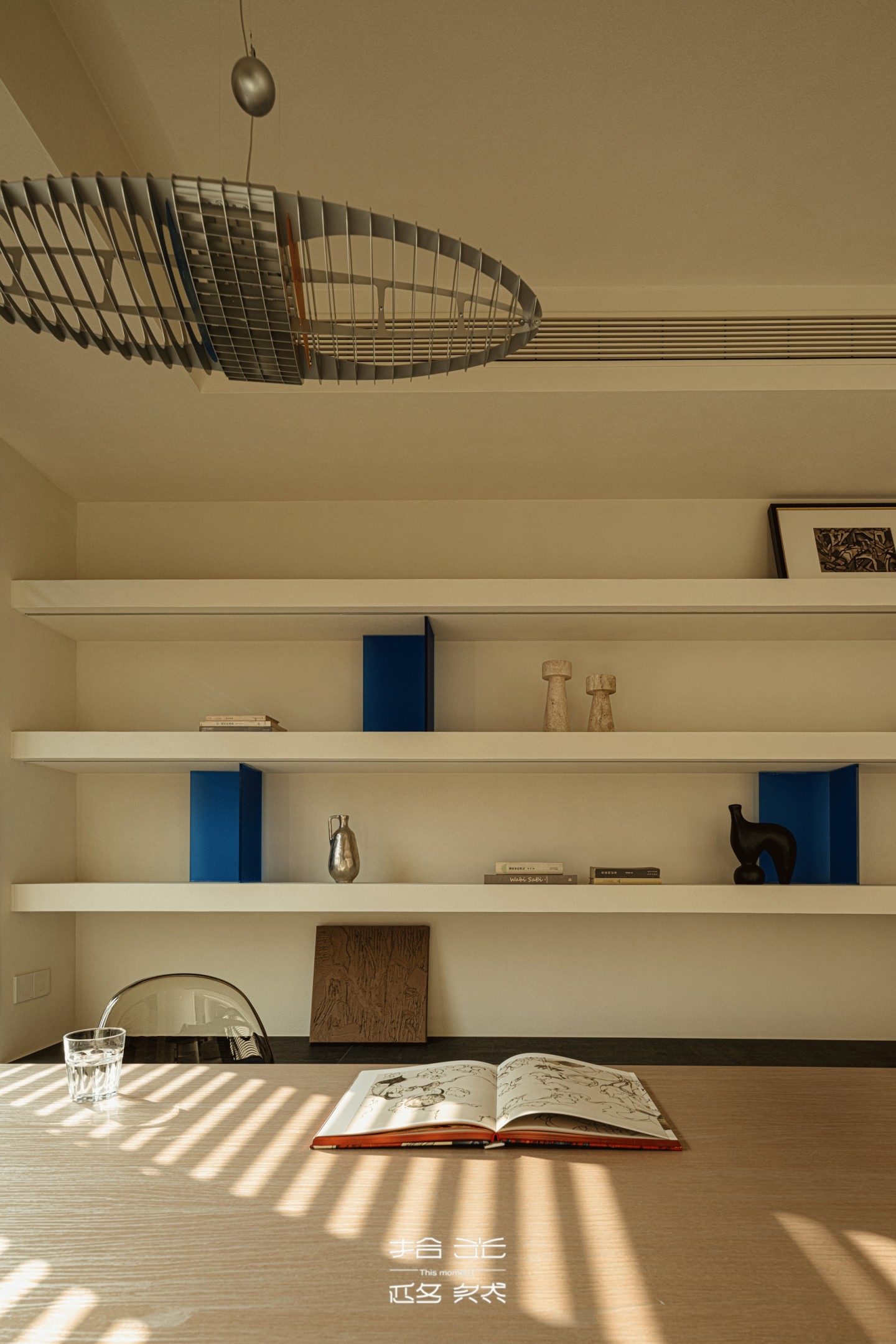 百叶筛过的光斜斜落在书桌上,把翻开的书页染成暖金色;墙面置物架里的靛蓝装饰,与客厅边几的跳色遥遥呼应,让书房的安静里,也藏着空间美学的暗线。偶尔有风从窗缝钻进来,书页轻轻晃,宝宝的笑声裹着光飘进来,这方小小的书房,便成了时光与暖的容器。