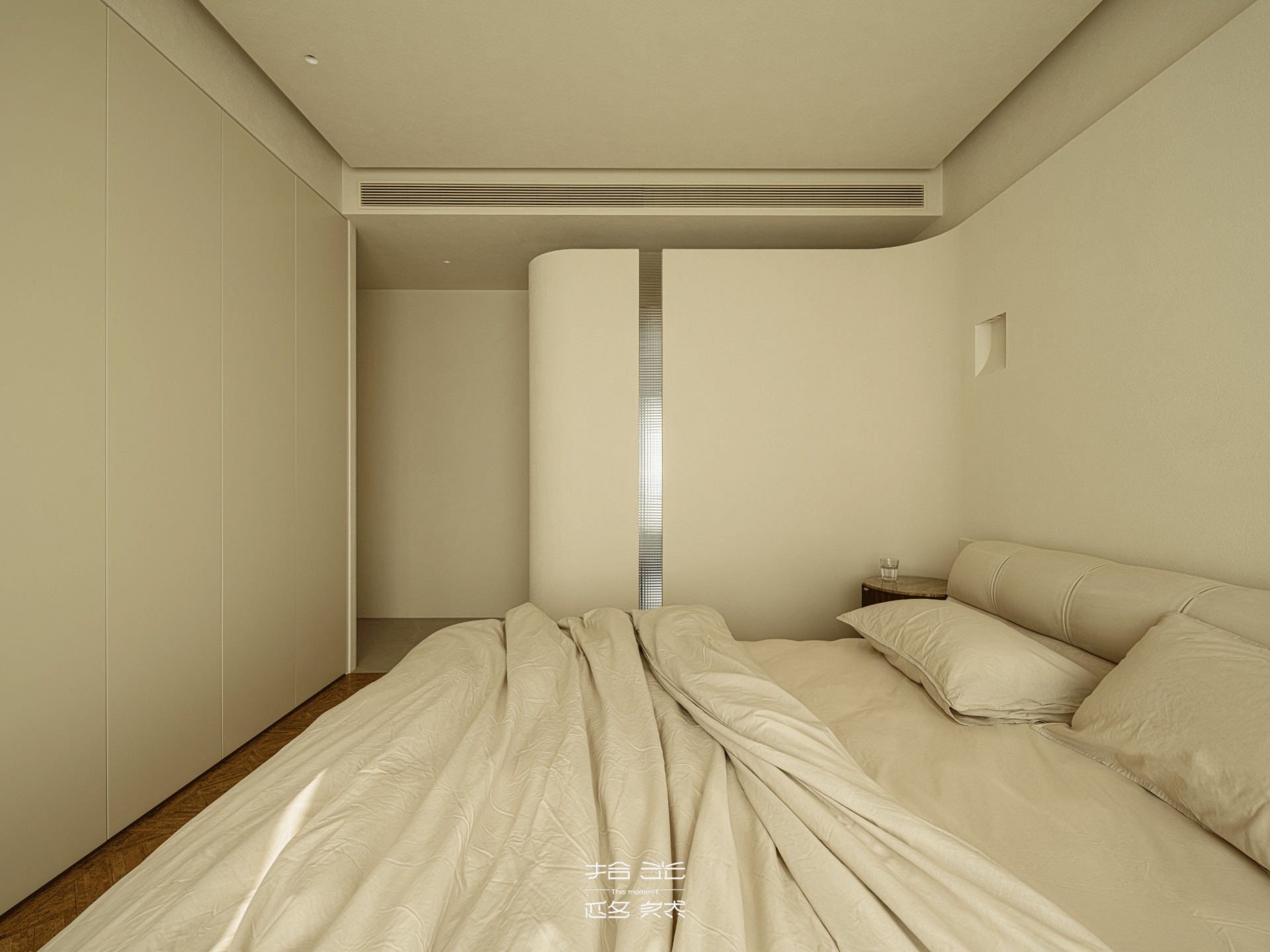 主卧与卫浴之间,一道圆弧玻璃隔断轻轻隔开两个空间,却没挡住光线的流转 —— 清晨的阳光透过玻璃,在床铺上洒下细碎的光斑,连空气都变得柔软。