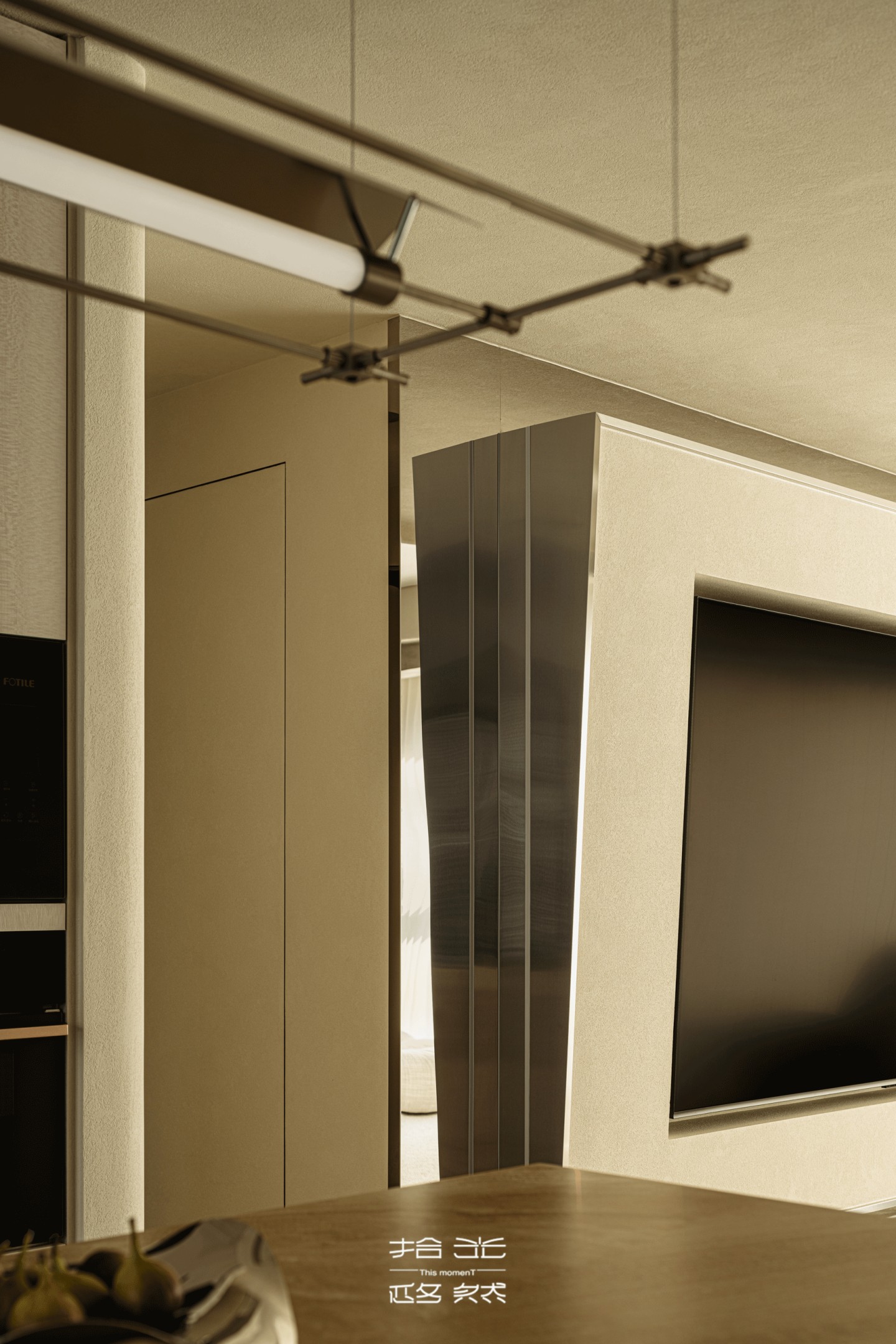 电视墙的台阶式造型在过渡处悄然显现,微倾的弧度既呼应了玄关竹节排列的纵向韵律,又暗合了废土肌理的质朴轮廓,管线藏在肌理深处,让这份过渡更显浑然天成。