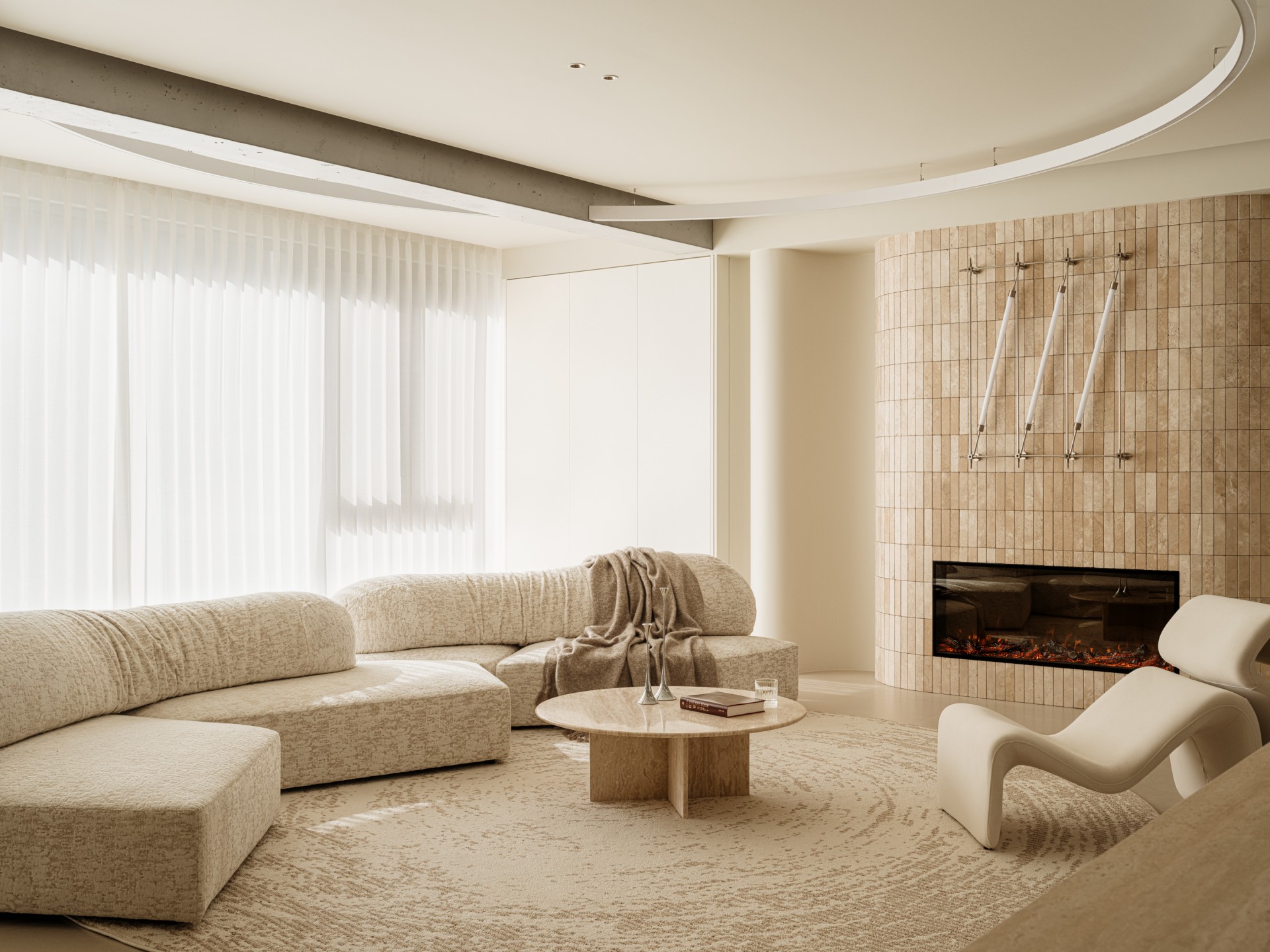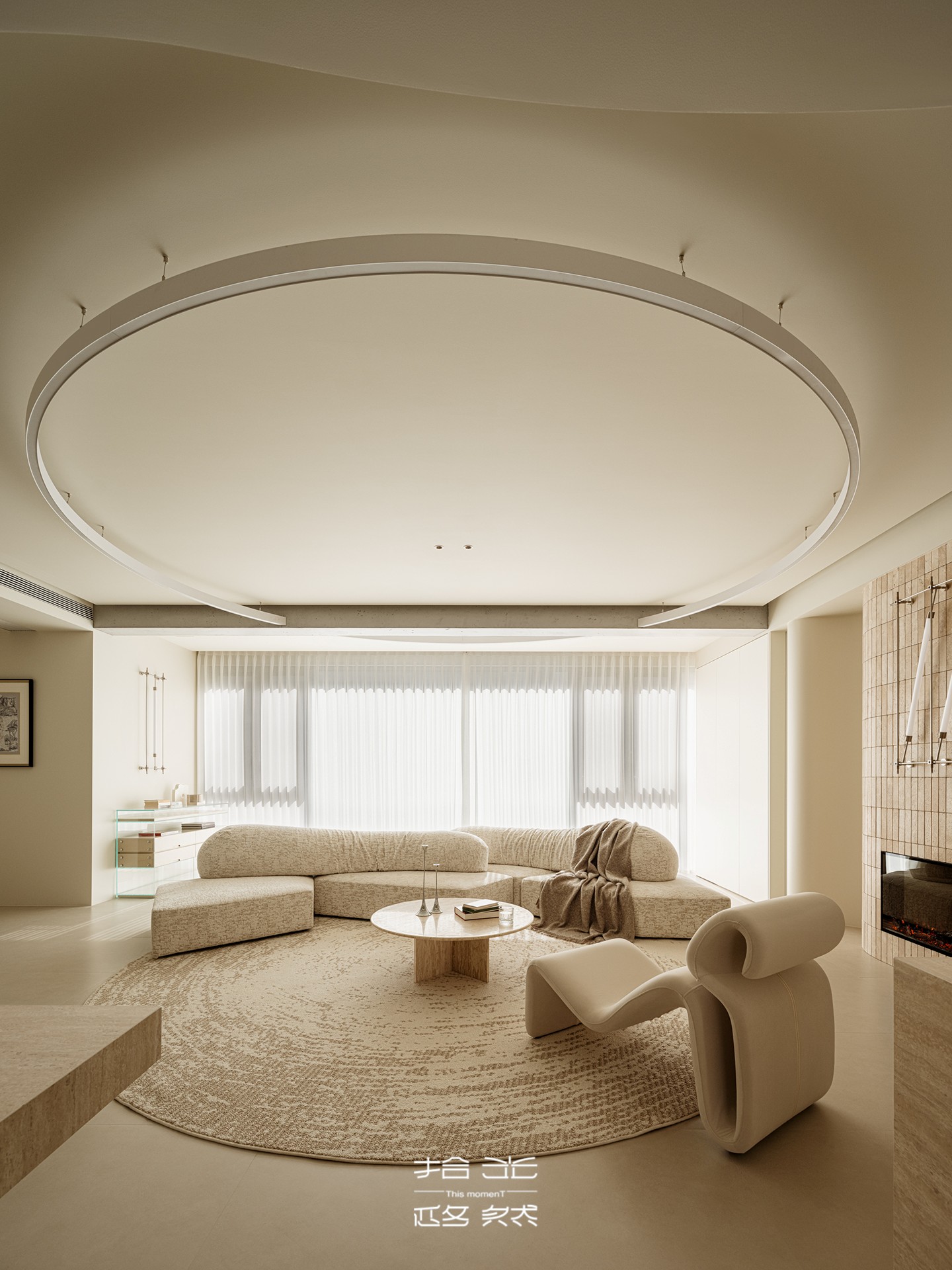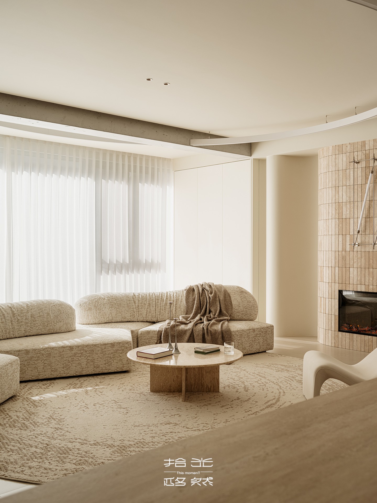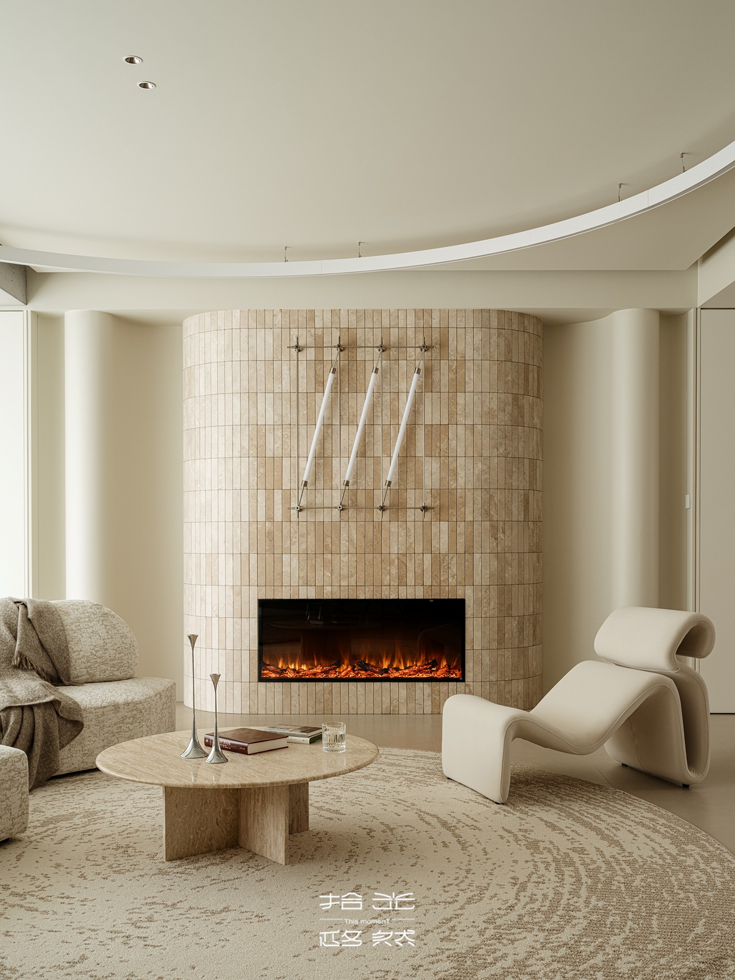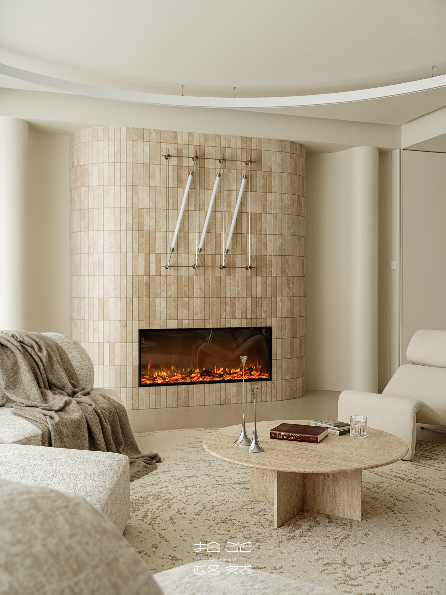 客厅 C 位交由对称式背景墙,融入 ArtDeco 风格元素,纯粹淡雅的色彩搭配独特造型,勾勒出极具戏剧张力的视觉焦点;温暖的壁炉设计,为清冷的空间添上柔软的温馨,让家的暖意,在细节处悄然流露。