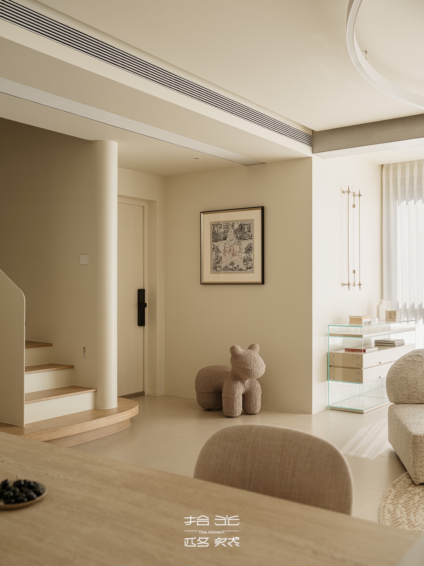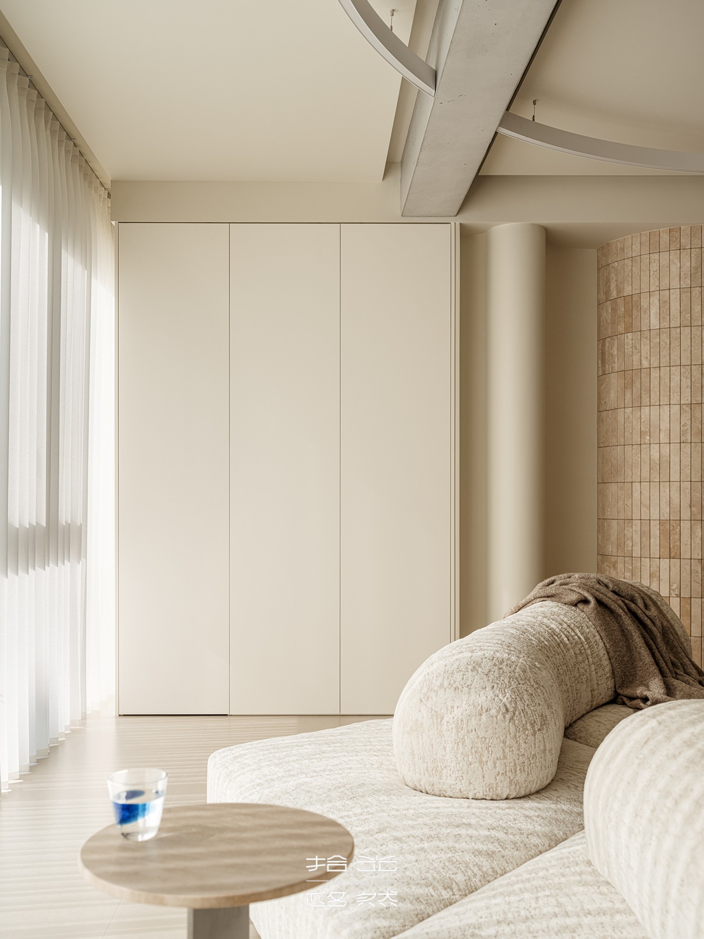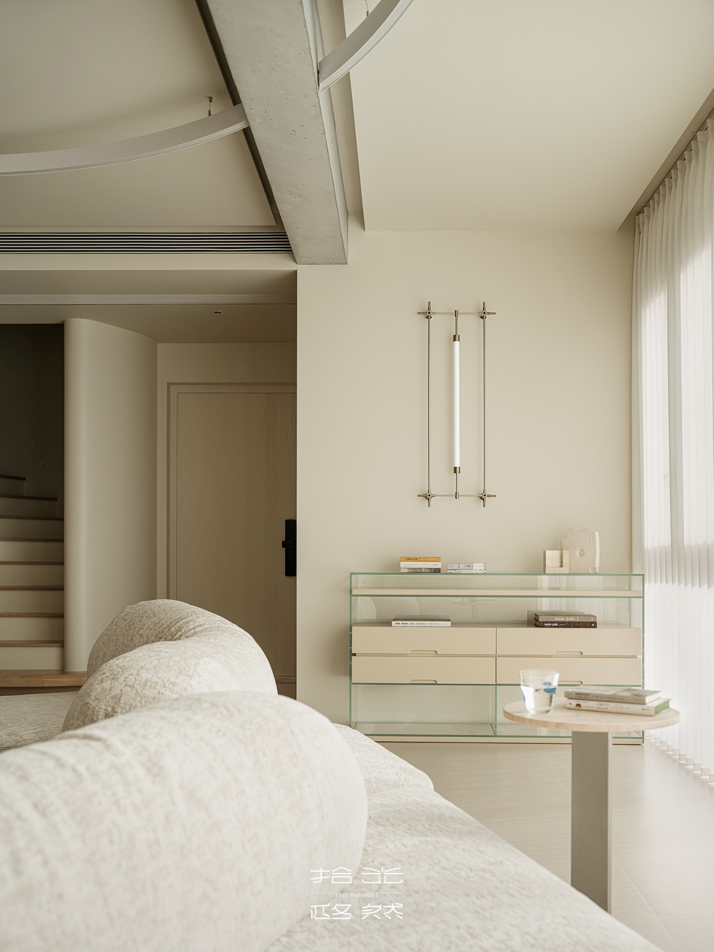 屋梁处的拉丝不锈钢包裹,与柔软的空间形成鲜明碰撞,增添现代冷峻的质感,柔与刚的巧妙结合,恰好契合屋主对「清冷与温馨」的空间期许。