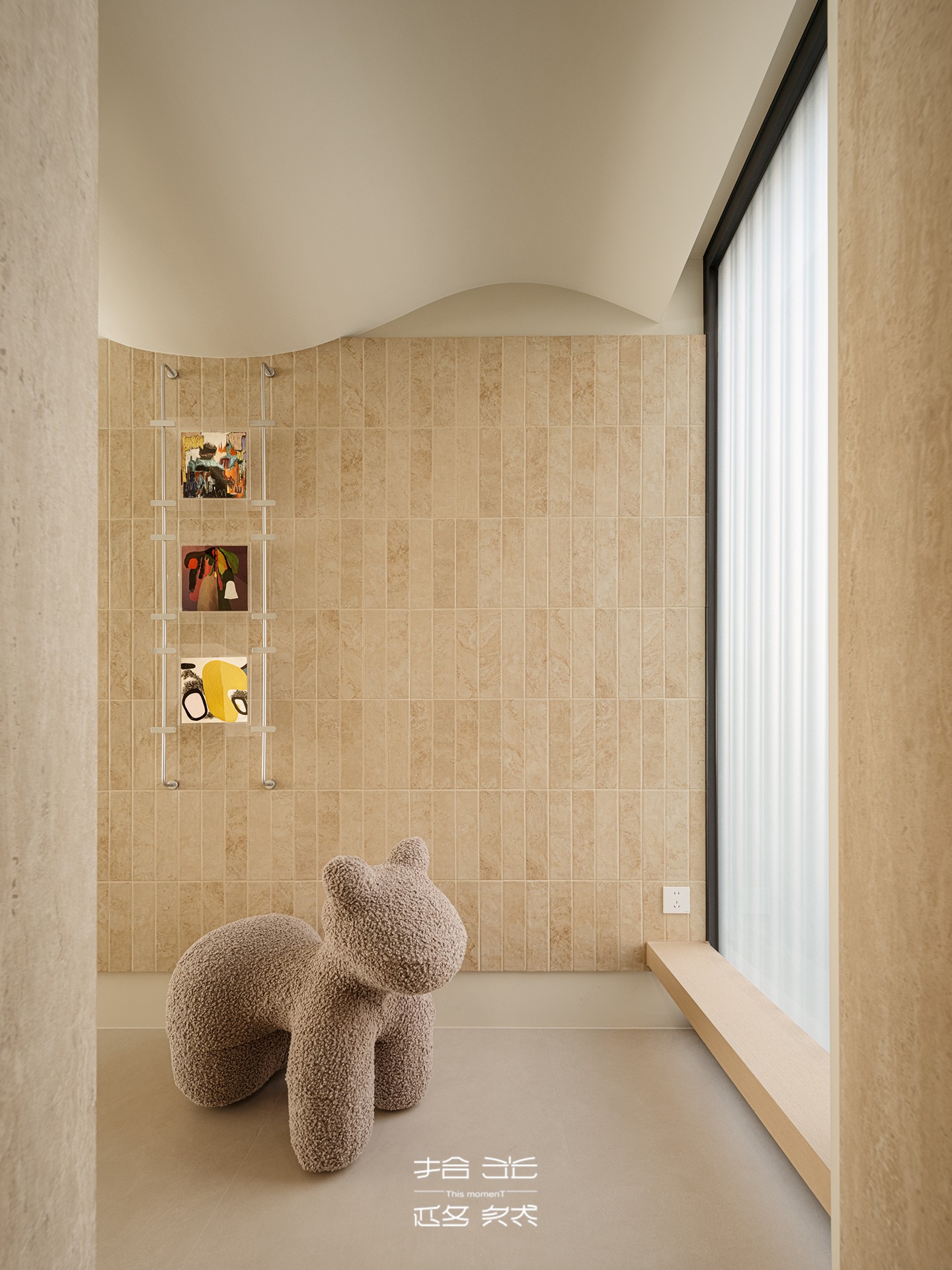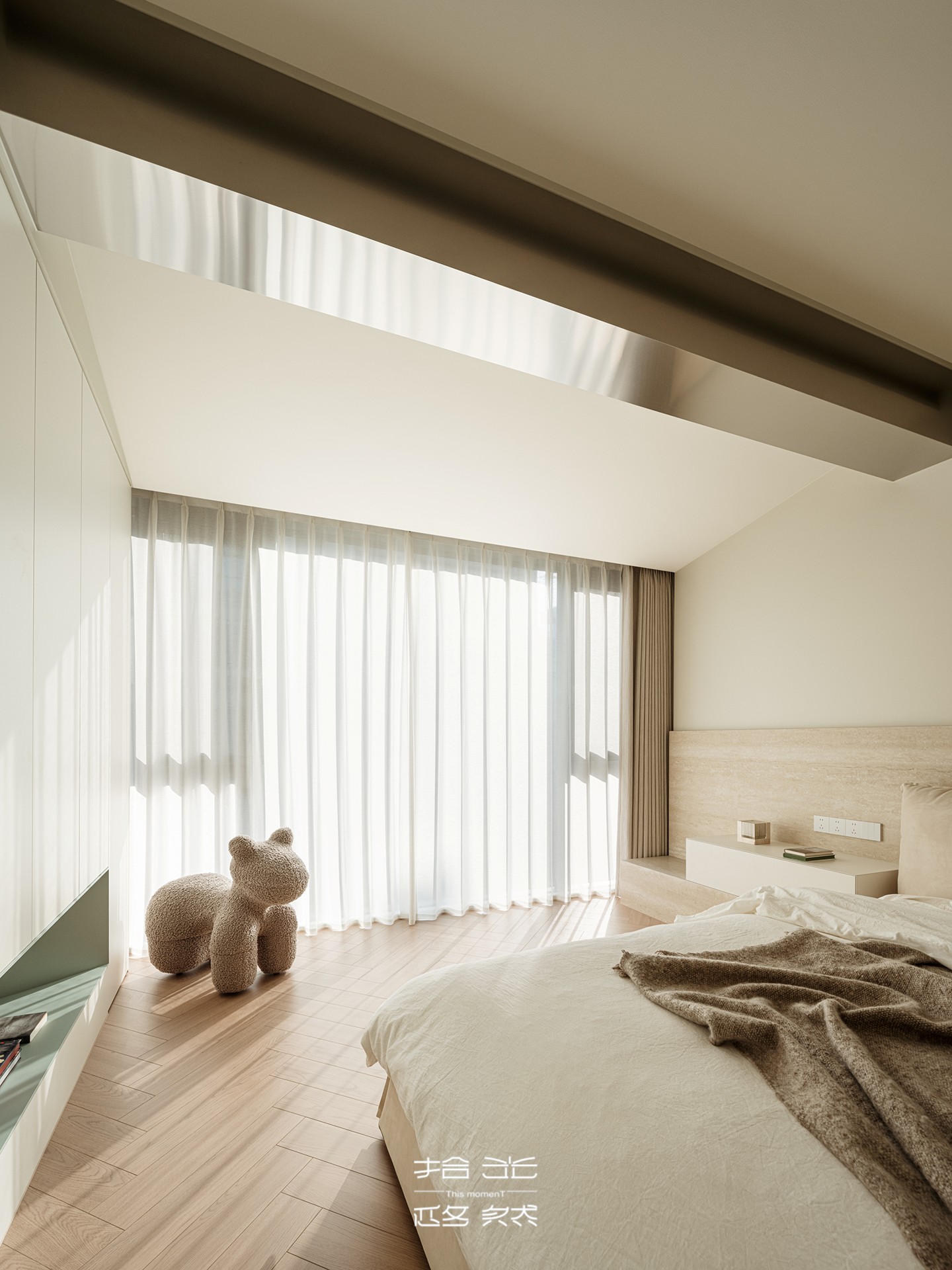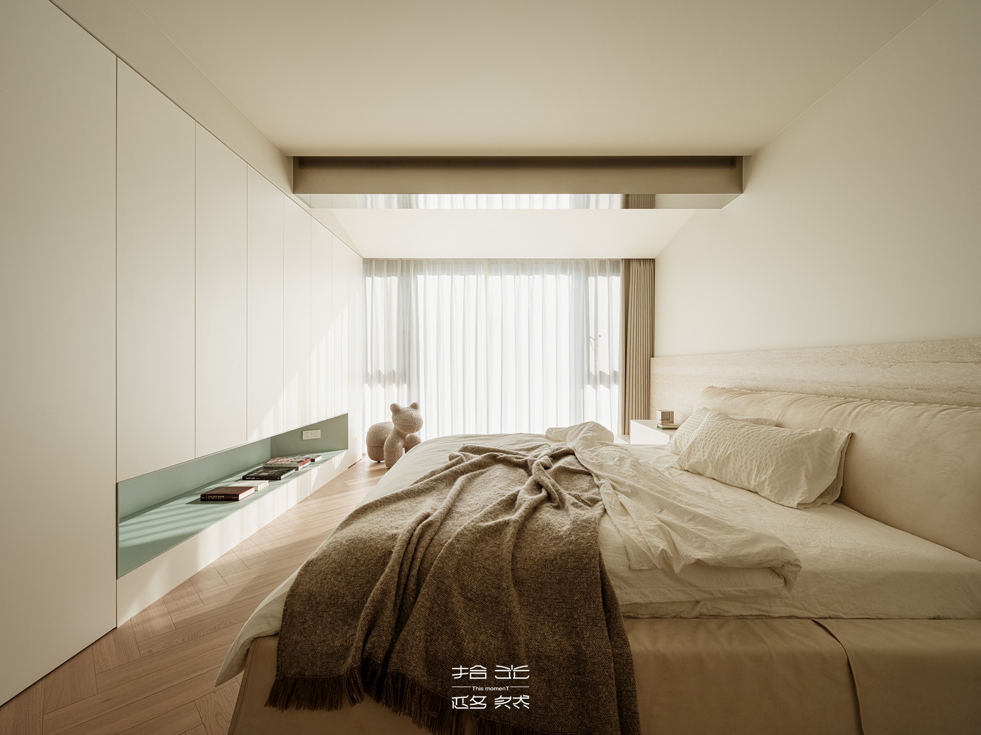 屋梁处的拉丝不锈钢包裹,与柔软的空间形成鲜明碰撞,增添现代冷峻的质感,柔与刚的巧妙结合,恰好契合屋主对「清冷与温馨」的空间期许。