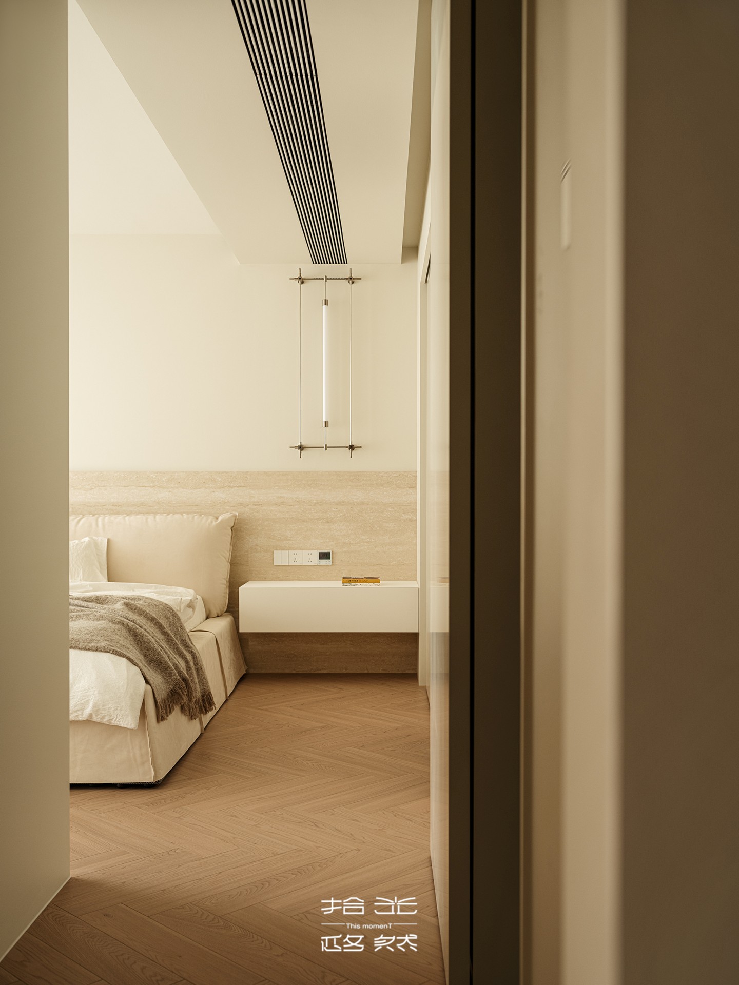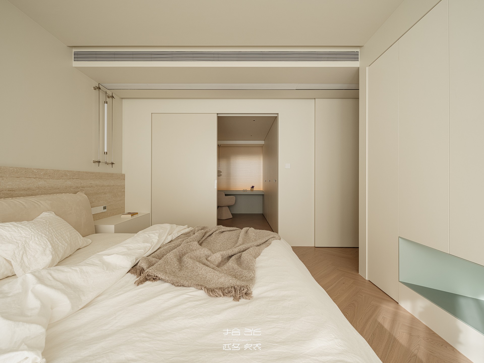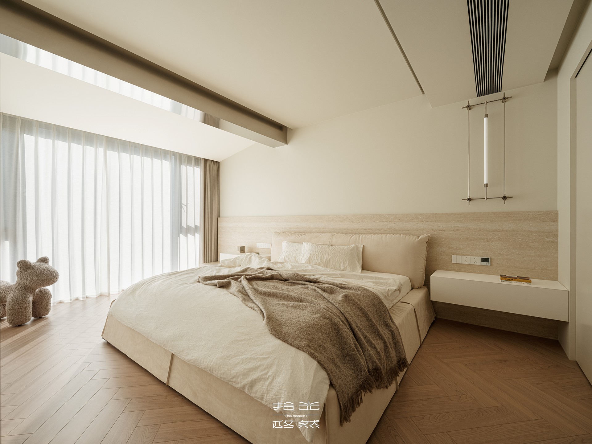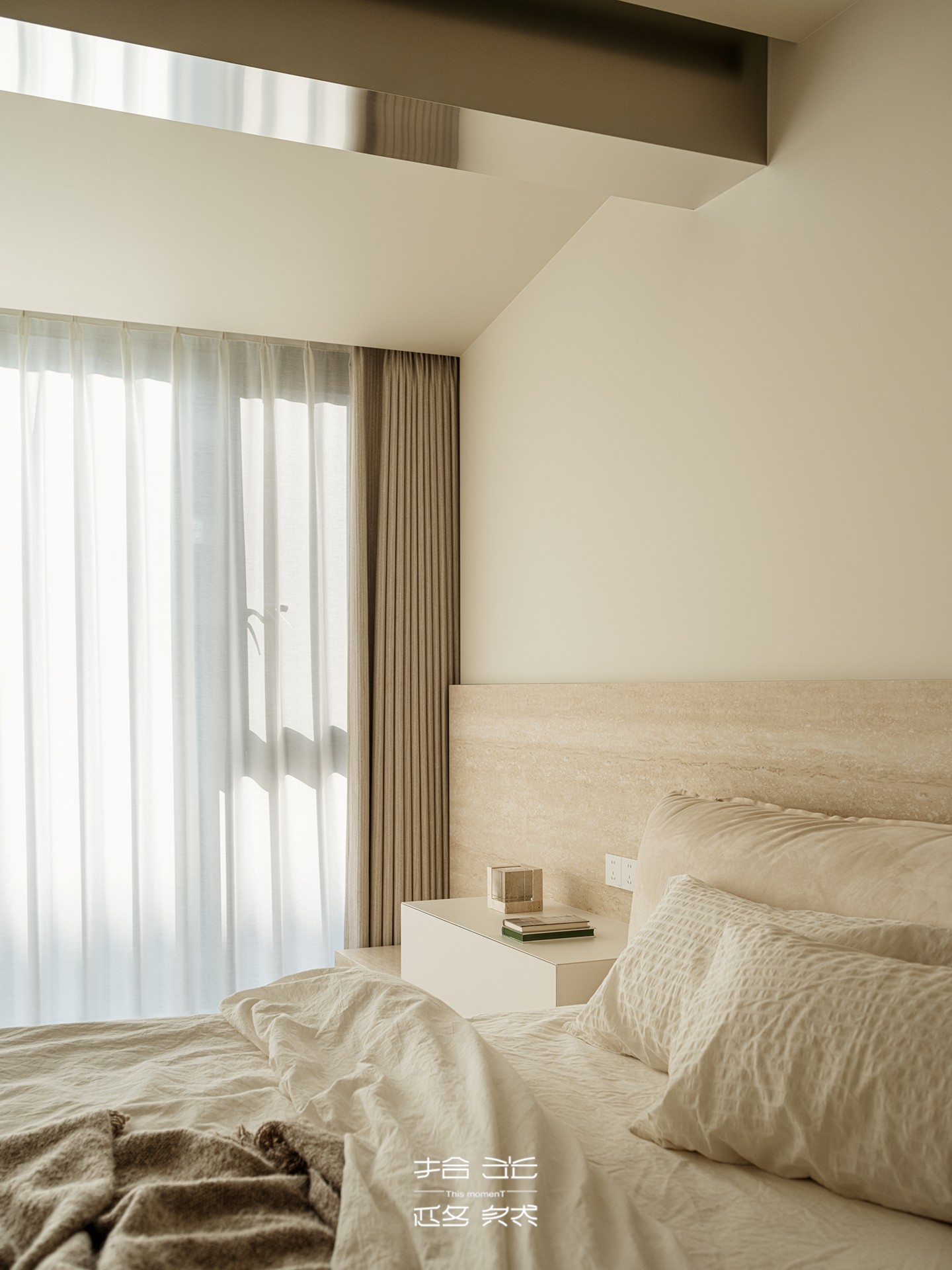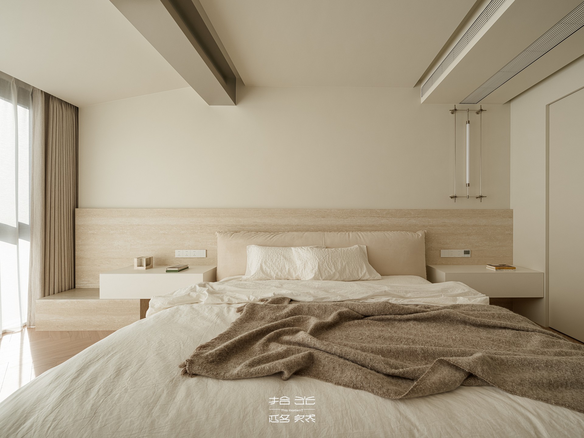 走进主卧,洞石岩板打造的床屏率先映入眼帘,其独特的自然肌理,为整个空间注入一份质朴与宁静。