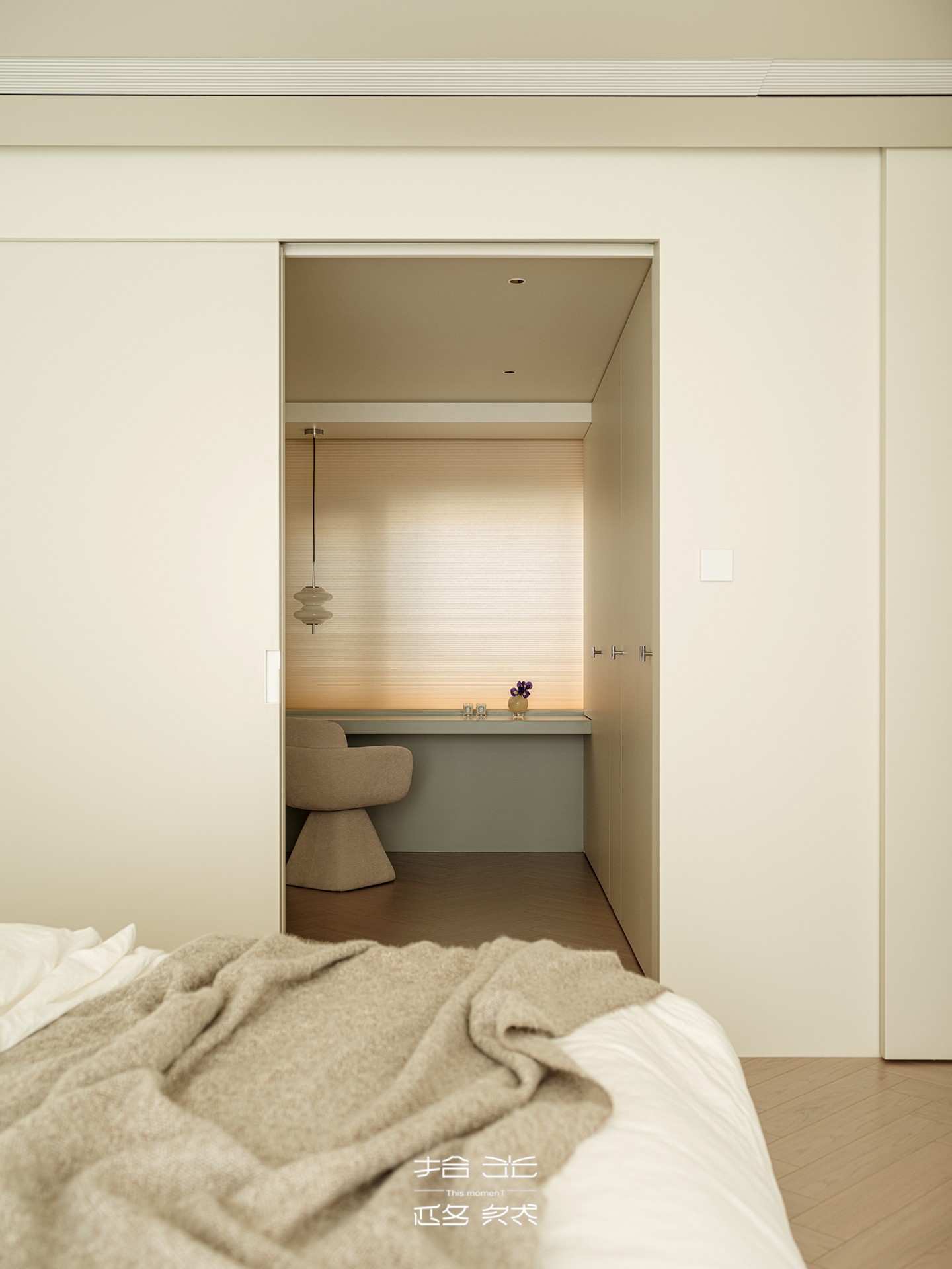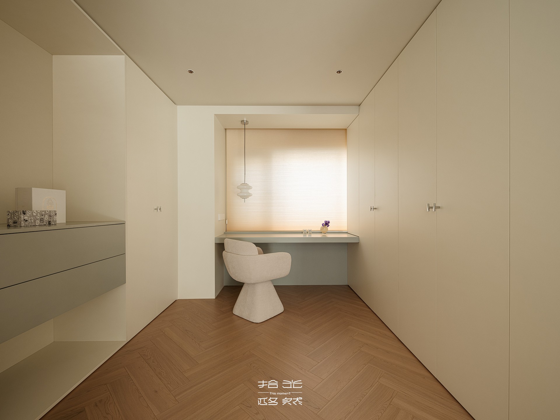 原始主卧布局重新规划,大幅扩大衣帽间面积,让其大于主卫,精准贴合屋主「挂放为主」的储物习惯,同时预留行李箱横放空间,完美适配二人频繁出差的职业需求;一整面柜体设计,为换季衣物、闲置物品提供充足收纳,让晨起挑选衣物的动线更顺畅,让生活的便捷,藏在每一个细节里。