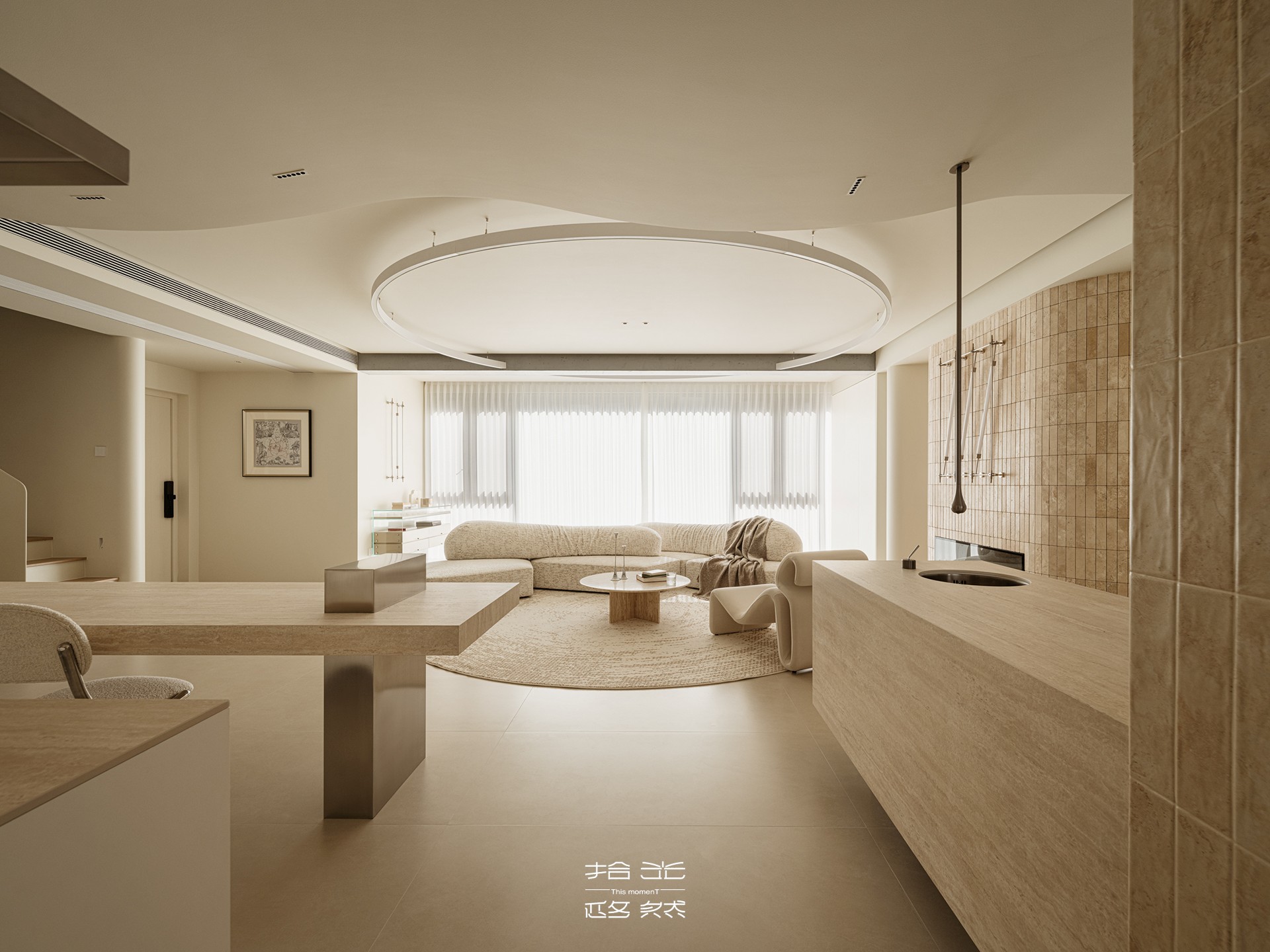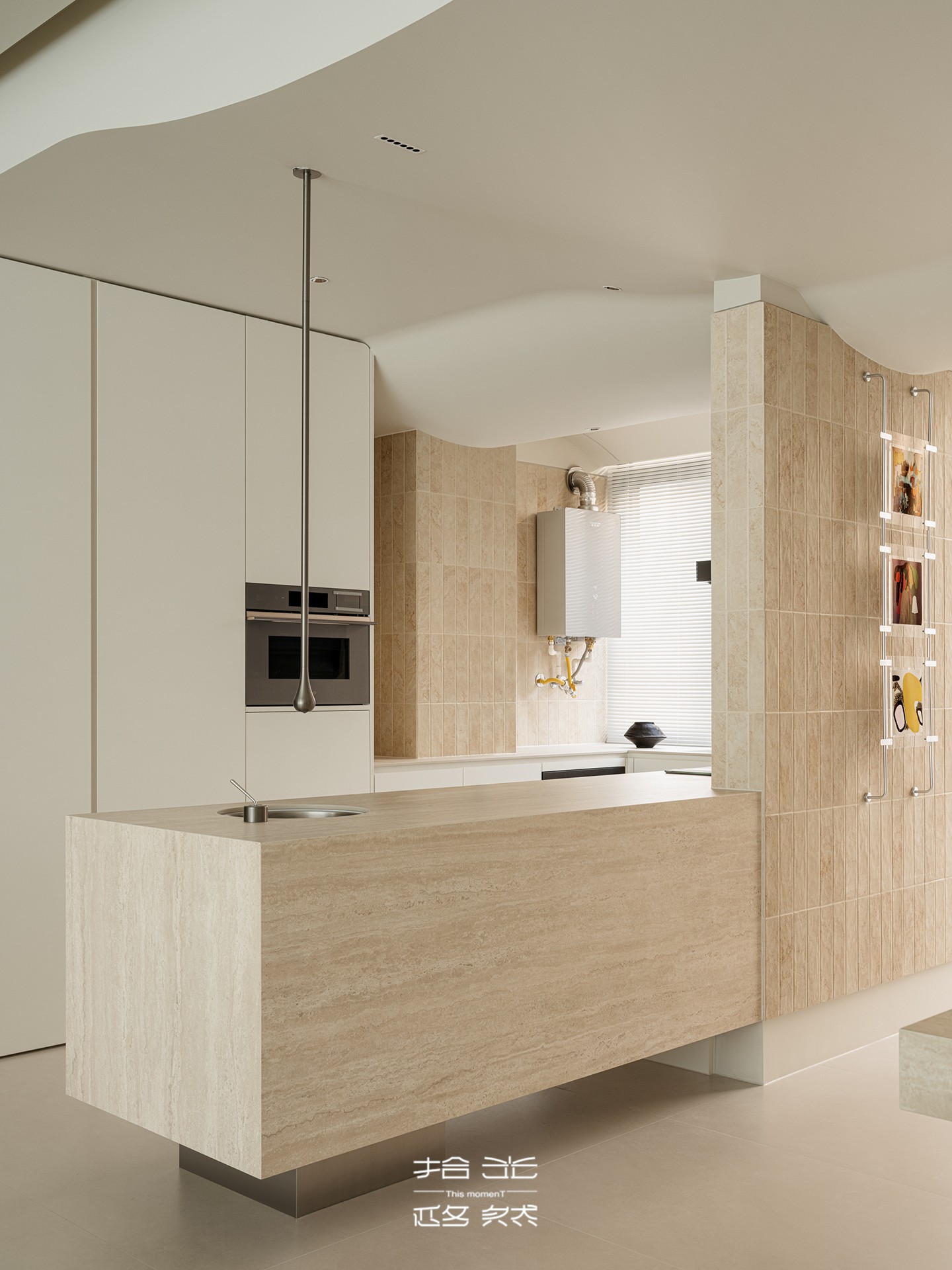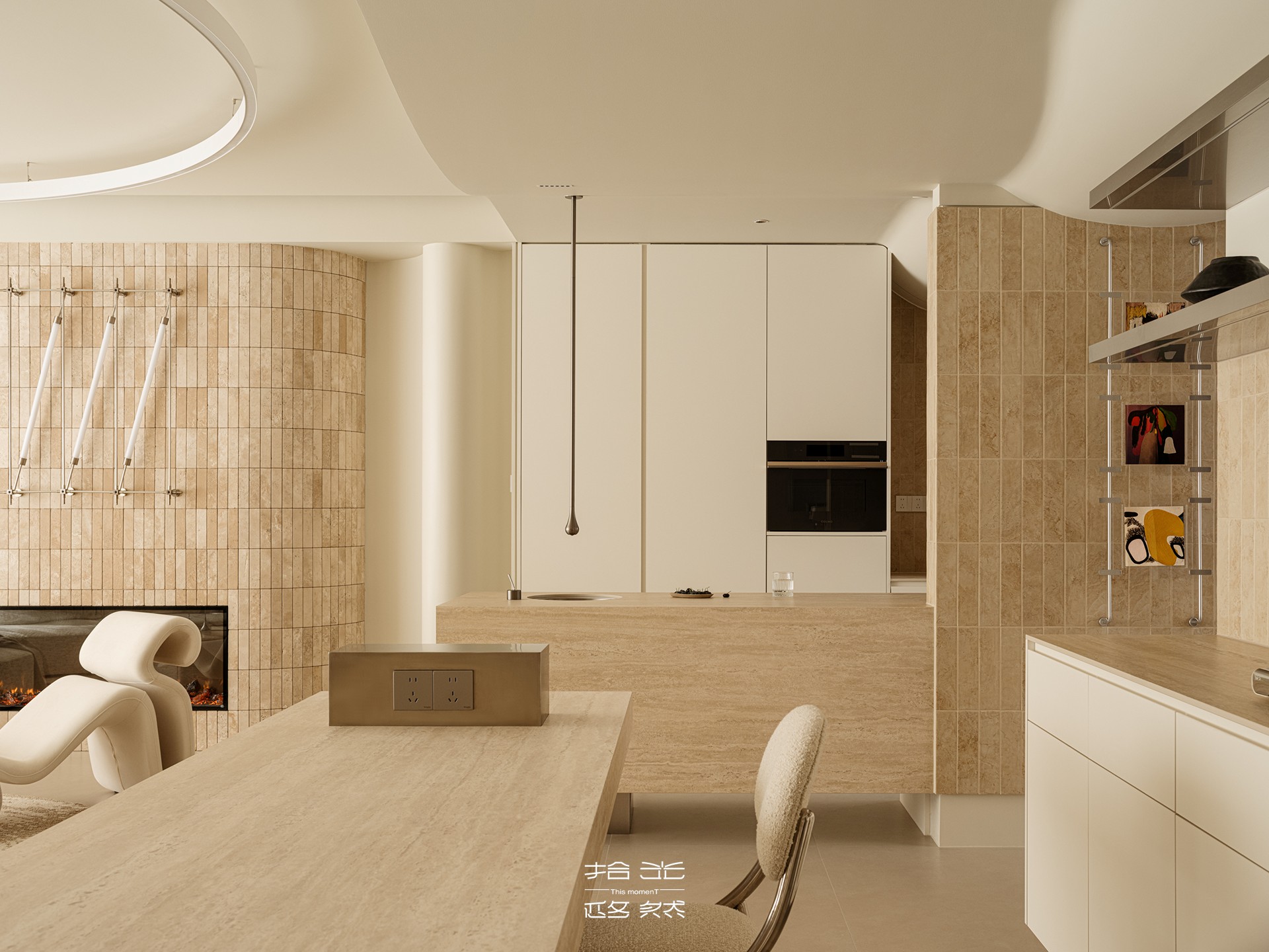 针对餐厅「T 型矮梁」与厨房矮梁的户型问题,设计动态流畅的波浪顶,设计师与施工执行师多次现场协调规划,将复杂的顶面落差温柔抚平,让原本杂乱的顶面变得和谐统一,层层递进的曲线,为空间增添丰富的视觉层次,让简约的空间里,藏着细腻的艺术表达。