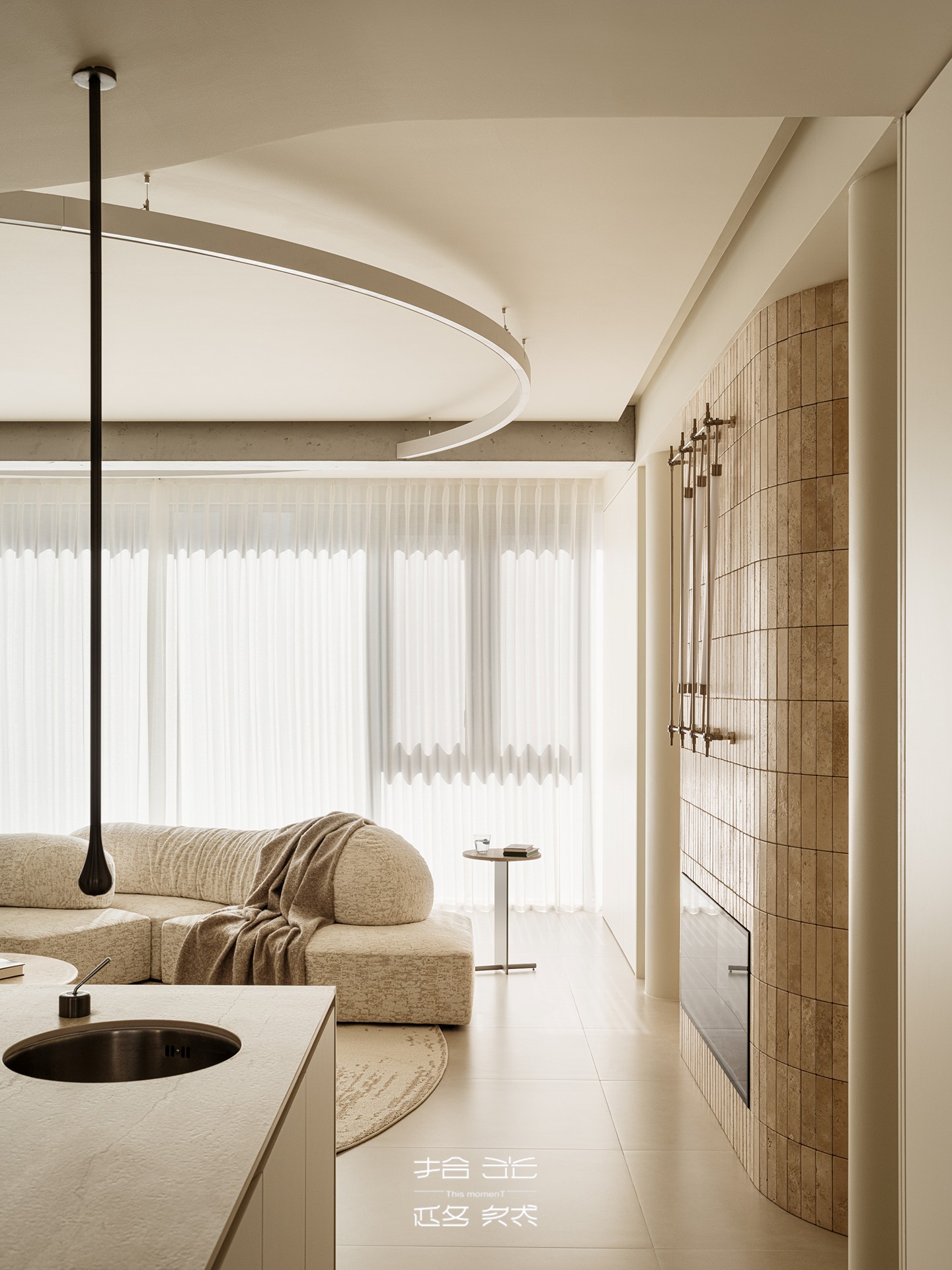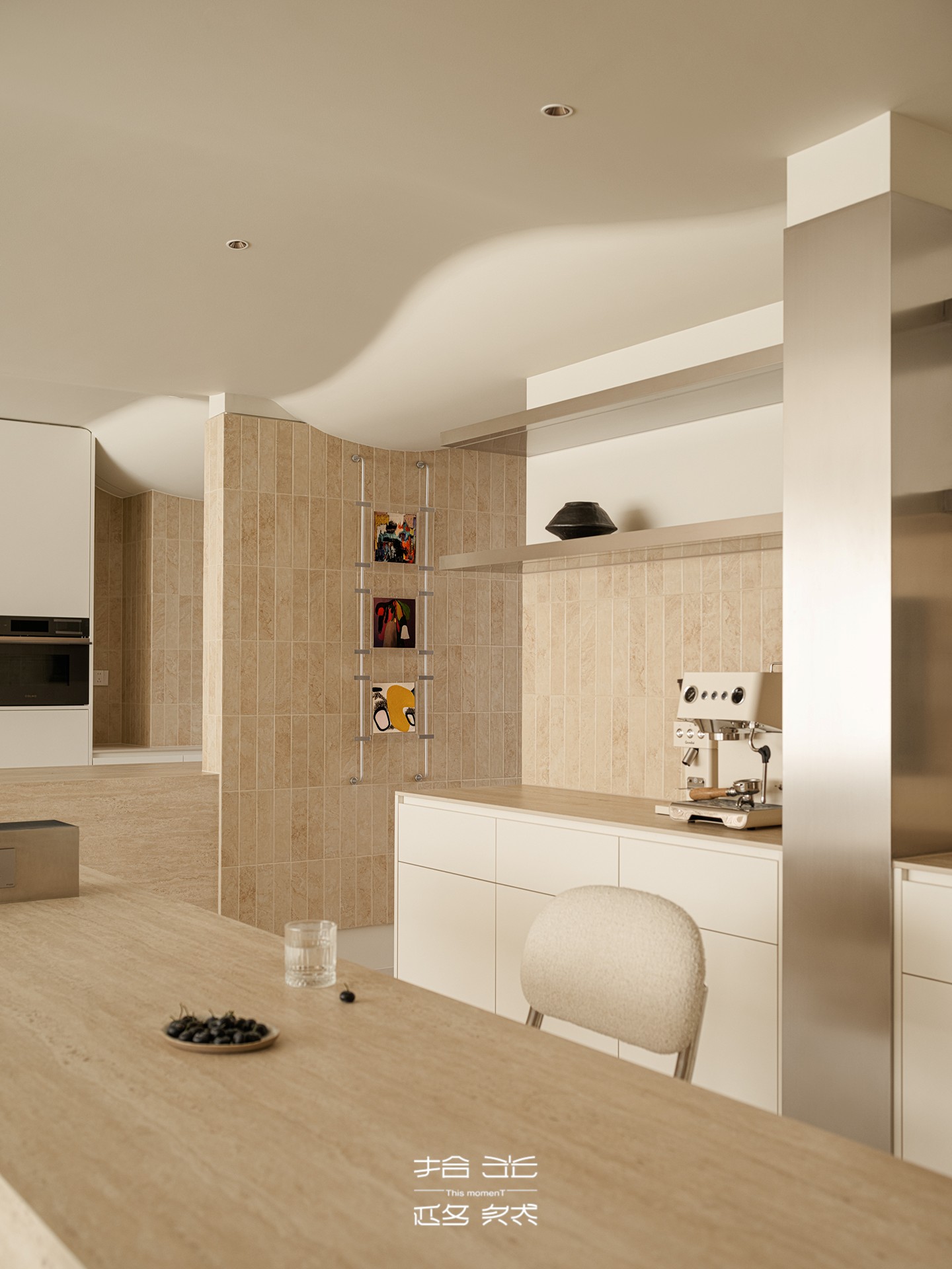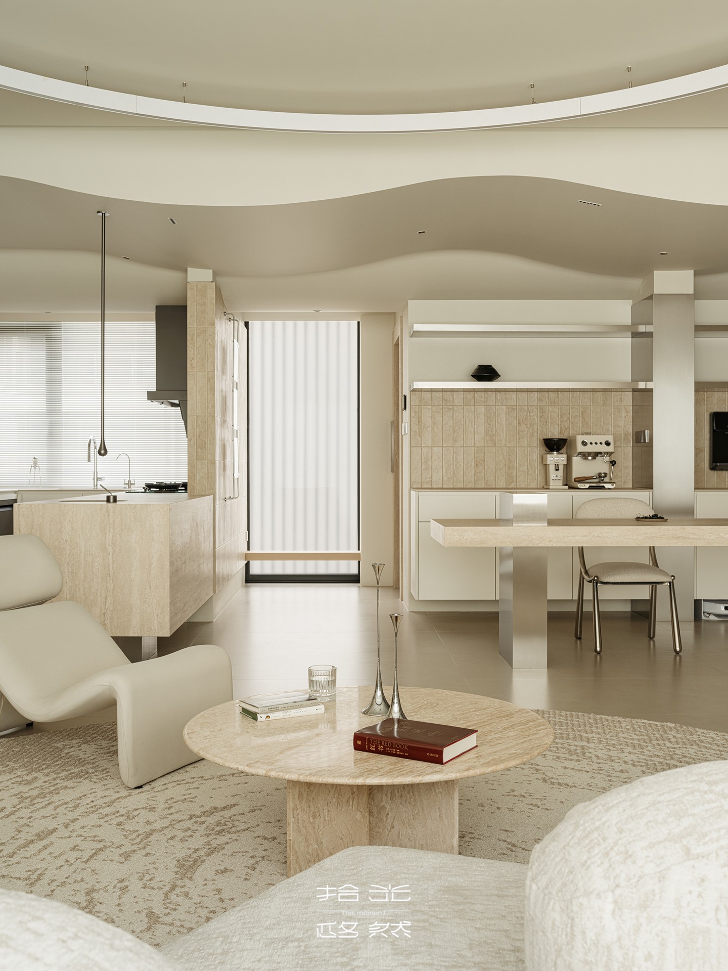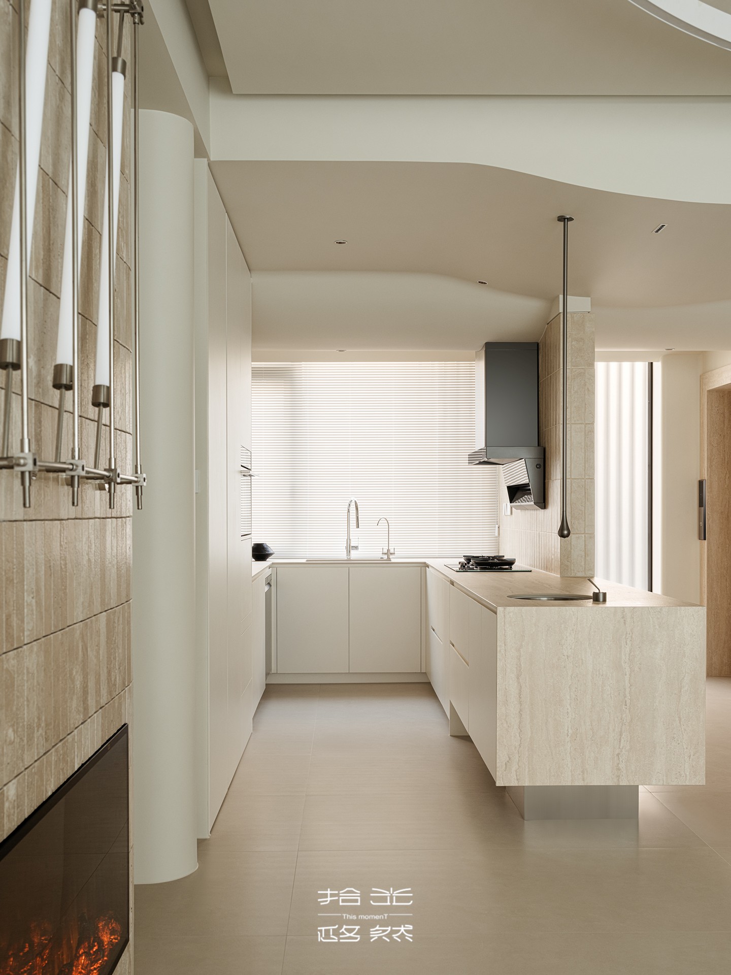 针对餐厅「T 型矮梁」与厨房矮梁的户型问题,设计动态流畅的波浪顶,设计师与施工执行师多次现场协调规划,将复杂的顶面落差温柔抚平,让原本杂乱的顶面变得和谐统一,层层递进的曲线,为空间增添丰富的视觉层次,让简约的空间里,藏着细腻的艺术表达。