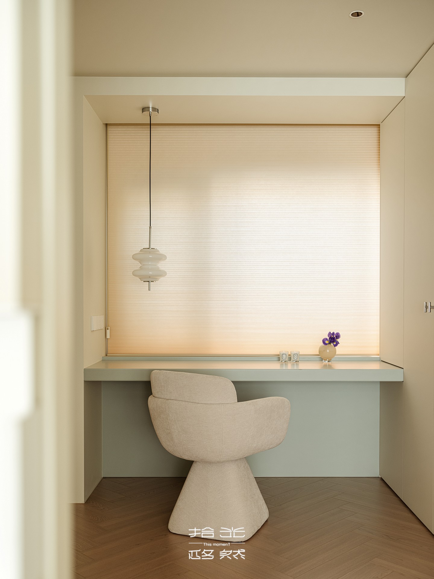 根据 1.7 米的女主人身高,扩容梳妆台并将其远离床位,避免化妆的细微噪音打扰伴侣休息,完美适配夫妻作息错位的需求。