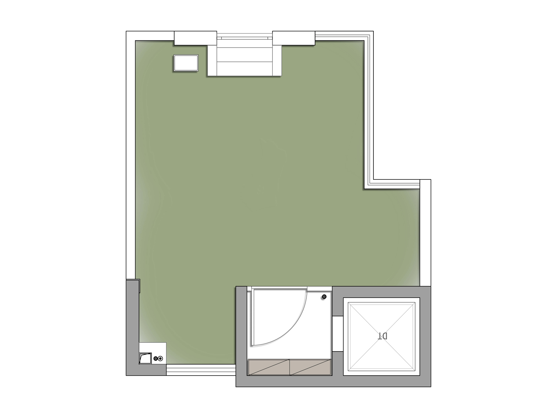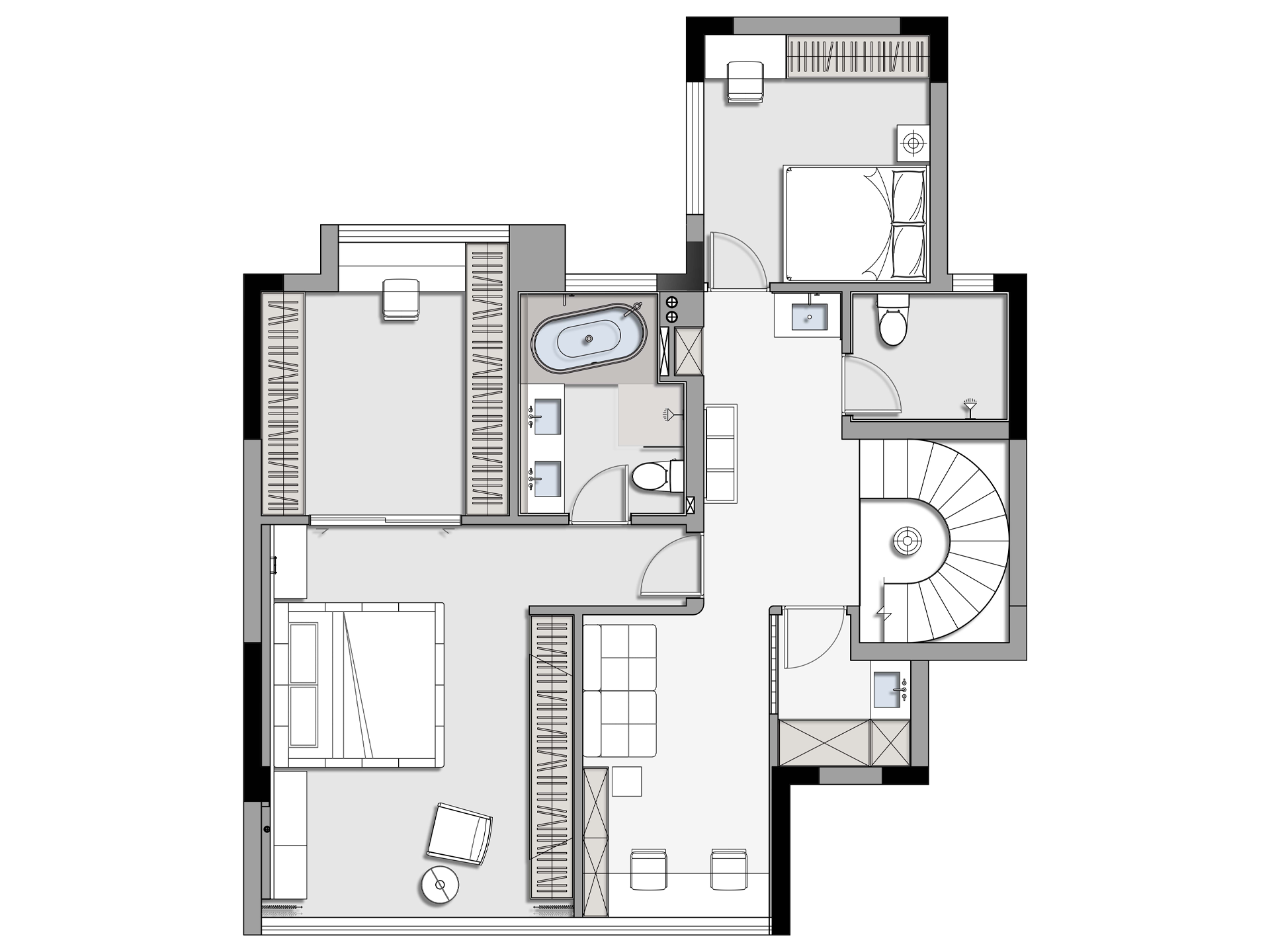 ⑧ 重构二楼卫浴布局,增设独立卫生间,实现双卫浴使用条件,适配屋主昼夜颠倒的作息特点,满足私密区域的使用需求。