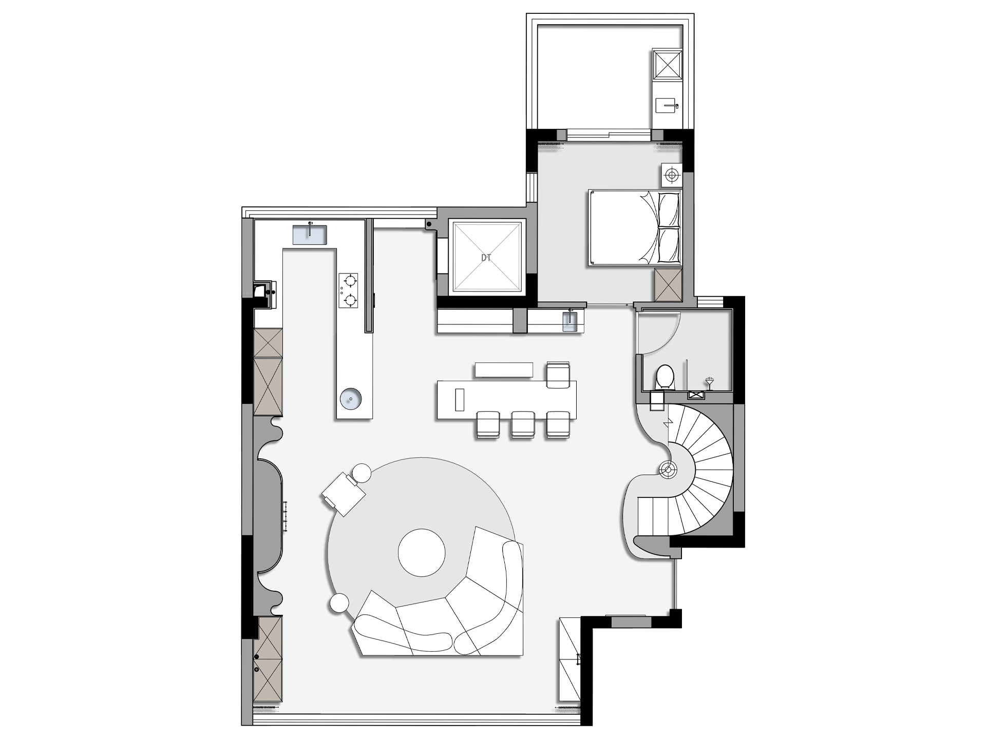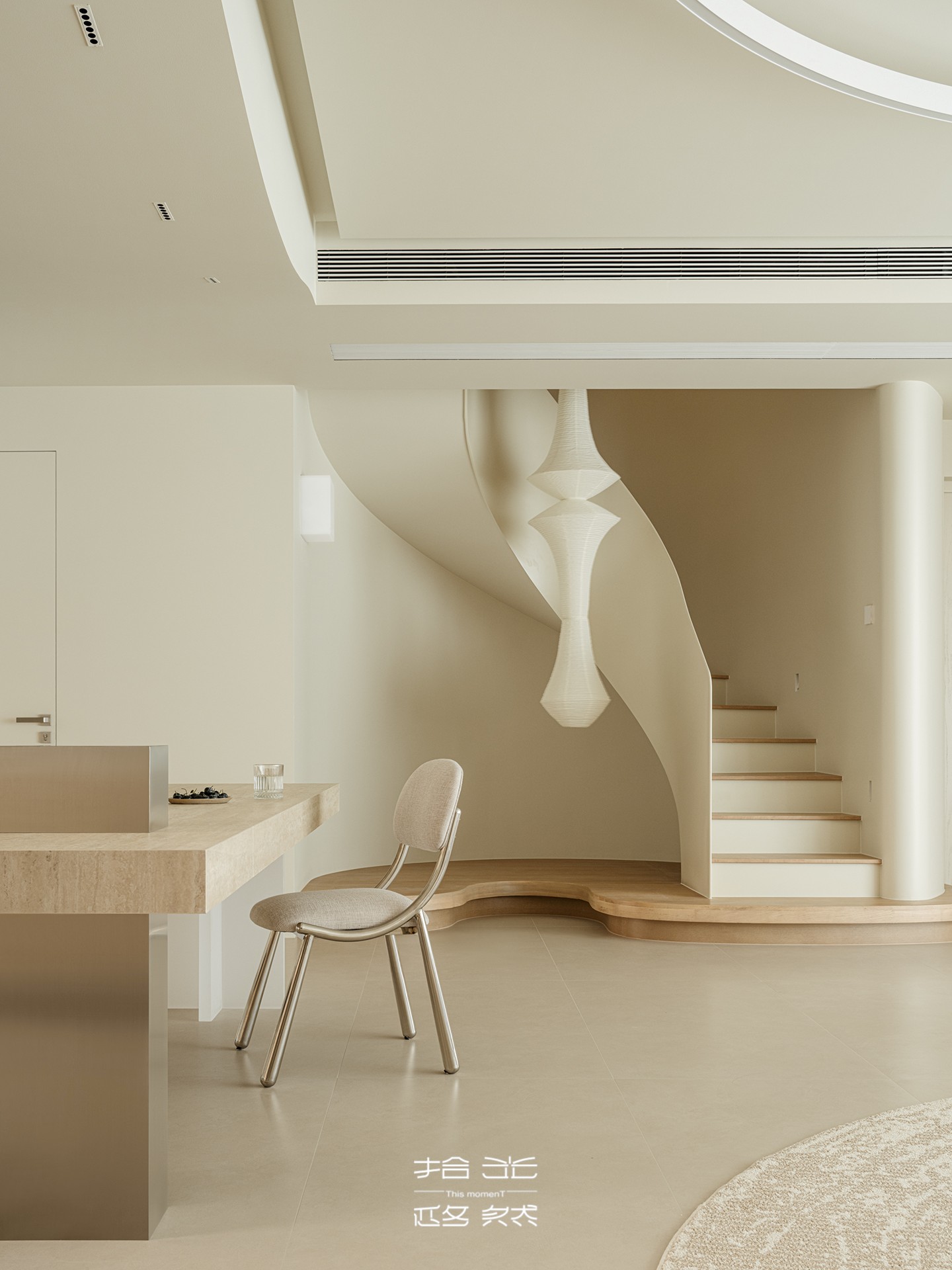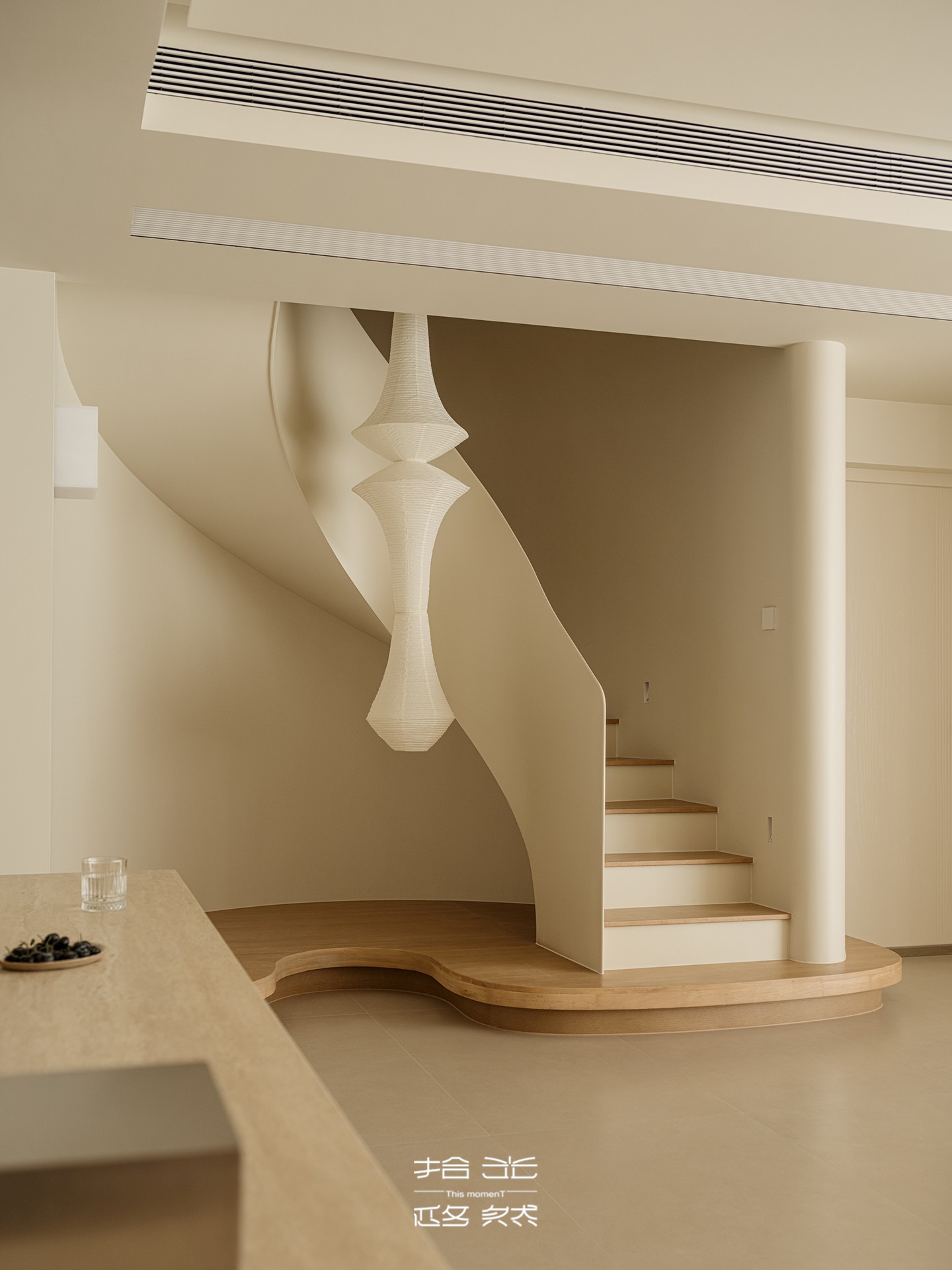 楼梯稳稳落在木质地台上,与地面的石材相互交织穿插,运用不同围度的圆弧元素解构重构,让楼梯构建出富有层次的空间结构,从不同角度看,都有独特的视觉魅力。