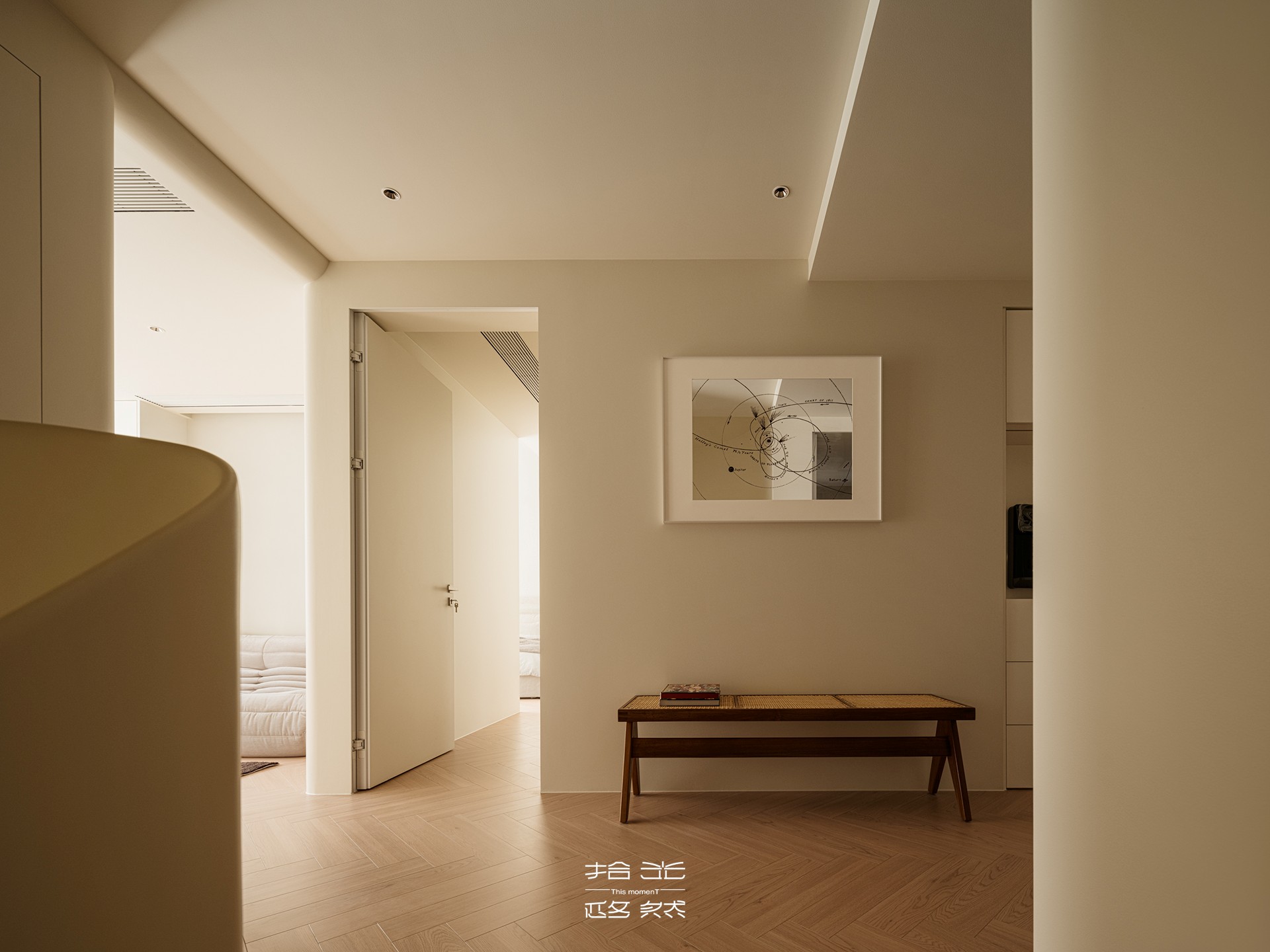 屋主是一对机长 + 空姐的夫妻,他们的居住需求,处处藏着职业与生活的专属印记。家中有年纪尚小的萌娃,现阶段与长辈同住,未来将回归核心家庭,长辈也会前来照料,这意味着空间要兼顾当下与未来的家庭结构变化。 他们对家的想象,是关乎记忆和时间的存在感,是一种清冷的疏离与柔软的温馨—— 不用繁复的造型堆砌,只希望家是能安放情绪的场所,是奔波后能卸下疲惫的港湾,既能满足一家三口的日常陪伴,也能承接亲友相聚的热闹,更能让作息不同的夫妻,在同一空间里互不打扰,各得其所。 与屋主的沟通中,我们发现其需求初显模糊,于是通过深度家访,挖掘出核心储物习惯(挂放为主)、梳理出原始户型的动线冲突,也剔除了书房台式机这类伪需求。从户型改造到细节设计,我们始终秉持「少造型、省预算」的理念,将英国艺术家 Jess Allen 《绘制的影子》的艺术构图融入空间,让简洁的线条、纯粹的质感,勾勒出兼具功能性与艺术感的居所,让家既有设计的温度,又有生活的本真。