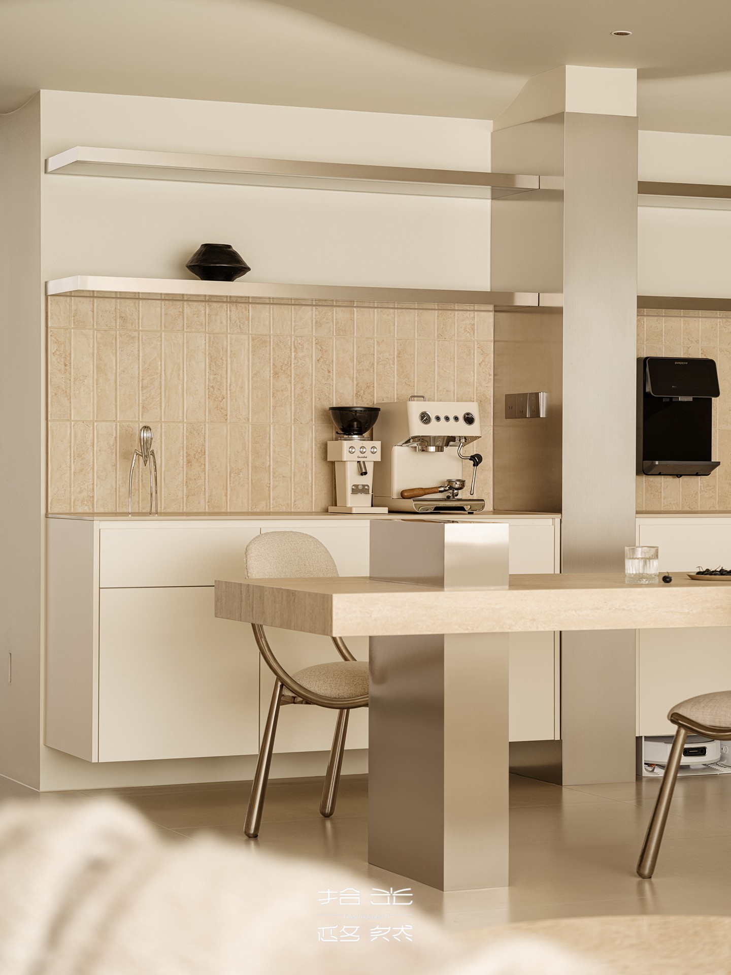 拉丝不锈钢从桌面穿插而过,与背后餐边柜的双重肌理相互呼应,让整个餐厅空间的整体性拉满,细节处尽显设计巧思。