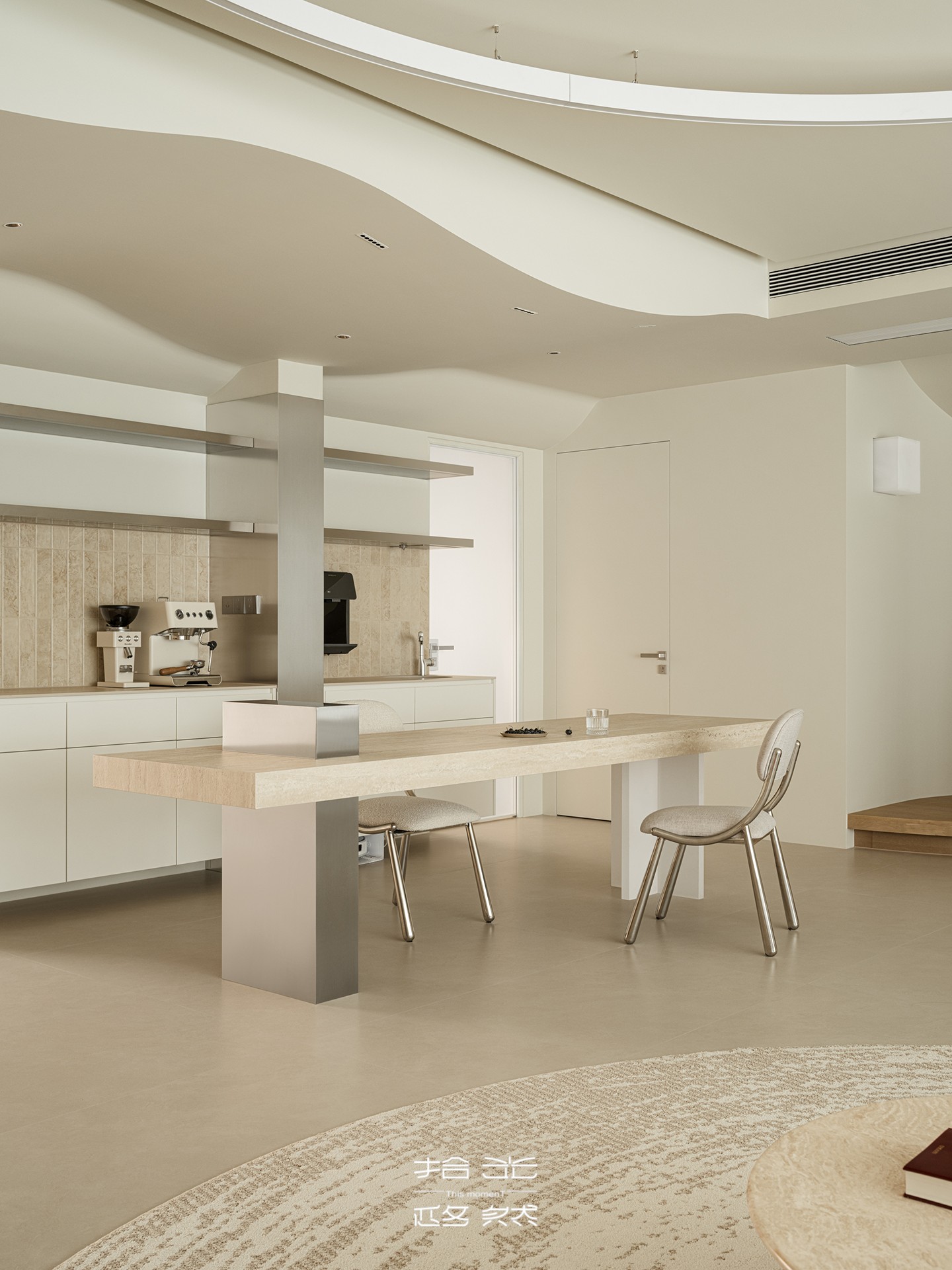 一张洞石岩板打造的长桌,简洁利落的线条,能轻松应对不同就餐人数的场景,满足一家三口一日两餐的从容,也能承接亲友到访的欢聚时刻。